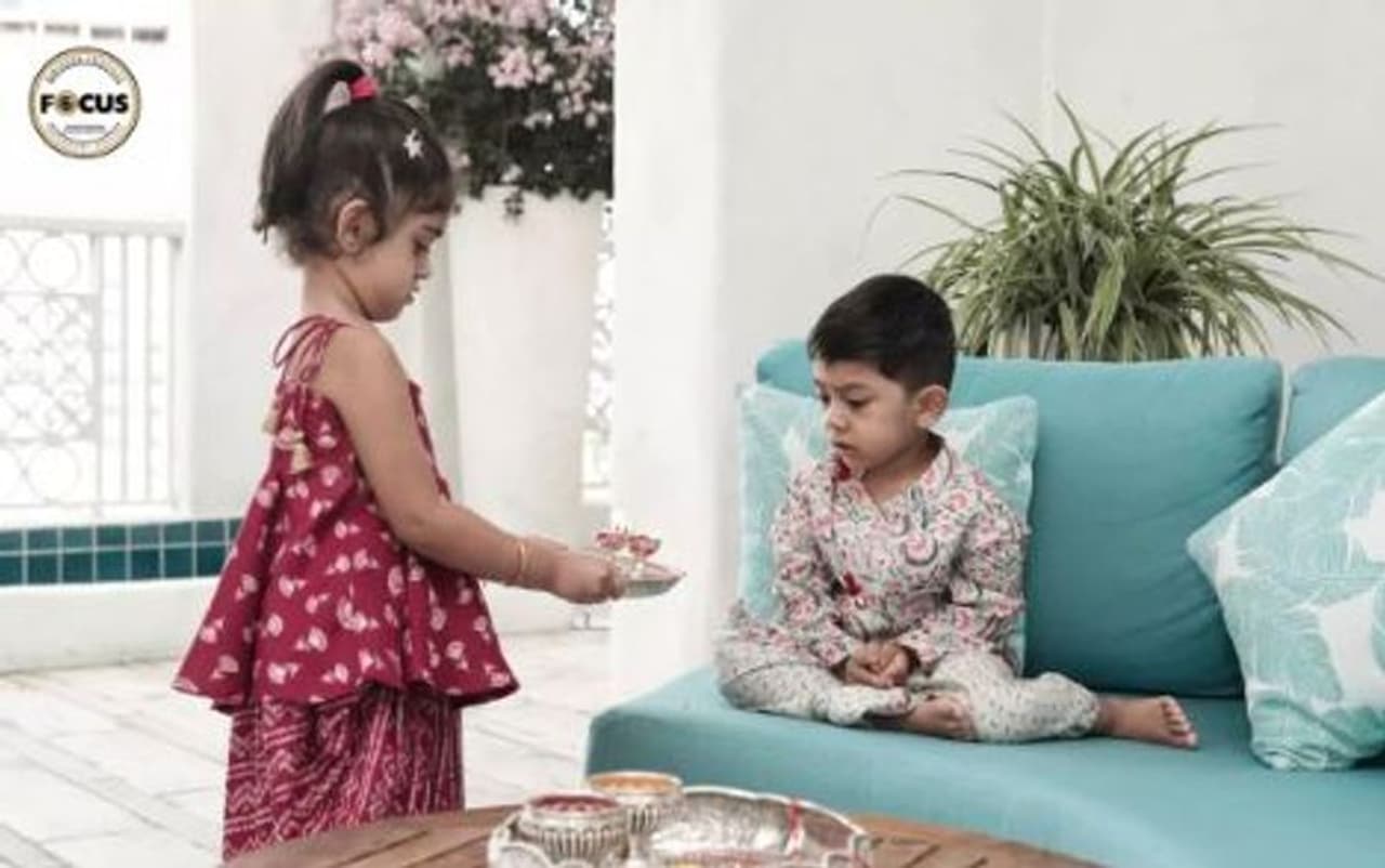 ಸೀಮೆಂಟ್ ಬಣ್ಣದ ಧೋತಿಯಲ್ಲಿ ಯಥರ್ವ್, ಮರೂನ್ ಬಣ್ಣದ ಮಾಡ್ರನ್ ಸೆಲ್ವಾರ್ನಲ್ಲಿ ಐರಾ ಮಿಂಚಿದ್ದಾಳೆ. ಇಬ್ಬರೂ ತುಂಟಾಟ ಮಾಡಿಕೊಂಡು ರಕ್ಷಾ ಬಂಧನ ಆಚರಿಸಿದ್ದಾರೆ.