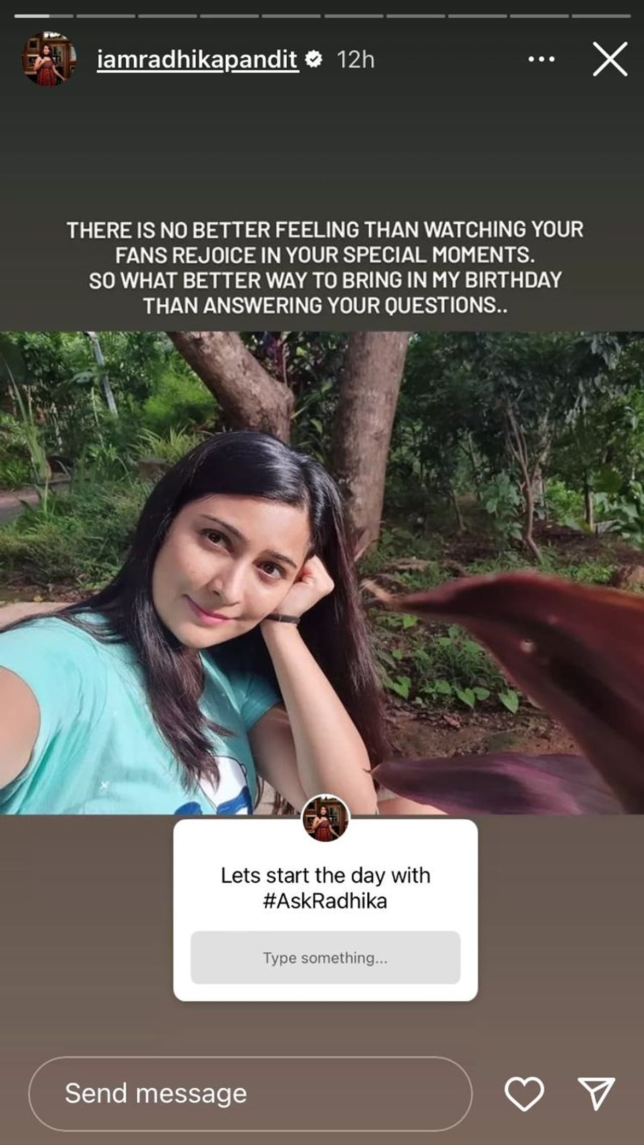 'ಅಭಿಮಾನಿಗಳು ನಮ್ಮ ದಿನ ಅವರ ಸ್ಪೆಷಲ್ ದಿನ ಎಂದು ಆಚರಿಸುವುದು ನೋಡಲು ಖುಷಿಯಾಗುತ್ತಿದೆ. ಈ ಹುಟ್ಟು ಹಬ್ಬದ ದಿನ ನೀವು ಕೇಳುವ ಪ್ರಶ್ನೆಗಳಿಗೆ ಉತ್ತರ ಕೊಡುವೆ' ಎಂದು ರಾಧಿಕಾ ಬರೆದುಕೊಂಡಿದ್ದಾರೆ.