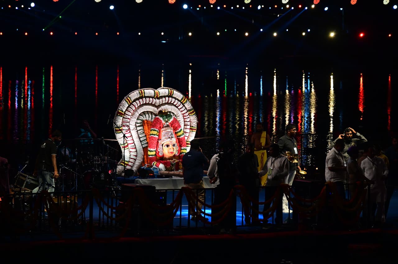 ಸ್ಯಾಂಕಿ ಟ್ಯಾಂಕ್ ಕೆರೆ ಬಳಿ ಸಂಜೆ 6.30ಕ್ಕೆ ಡಿಕೆ ಶಿವಕುಮಾರ್ ದಂಪತಿ, ಸಚಿವ ದಿನೇಶ್ ಗುಂಡೂರಾವ್ ಹಾಗೂ ಸಚಿವ ರಾಮಲಿಂಗರೆಡ್ಡಿ ಕಾವೇರಿ ಆರತಿ ಮಾಡಿದರು. ಅಲ್ಲದೇ ಸ್ಯಾಂಕಿ ಕೆರೆಯ ಮಧ್ಯೆದಲ್ಲಿ ಇರುವ ಇದು ತೇಲುವ ವೇದಿಕೆ. ಇದನ್ನು ಮುಂಬೈನಿಂದ ತರಸಲಾಗಿದೆ. ಇದು ಯಾವಾಗಲೂ ಇಲ್ಲಿ ಇರುವುದಿಲ್ಲ ಎಂದರು ಡಿಕೆಶಿ.