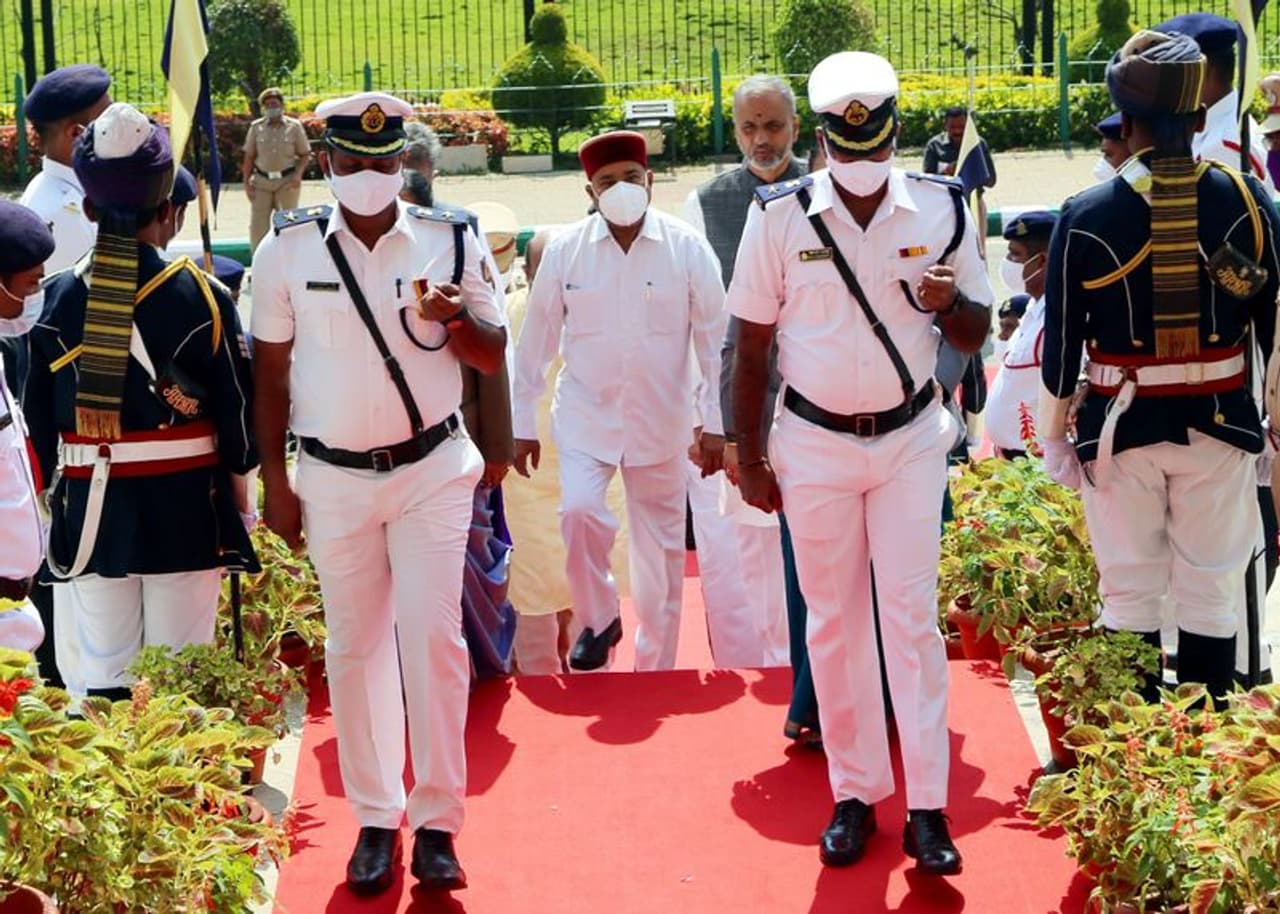 ನಗರದ ಸಶಸ್ತ್ರ ಮೀಸಲು ಪಡೆ ಬ್ಯಾಂಡ್ ಹಾಗೂ ಅಶ್ವಪಡೆಯ ಬೆಂಗಾವಲಿನೊಂದಿಗೆ ರಾಜಭವನದಿಂದ(Rajbhavan) ರಾಜ್ಯಪಾಲ ಥಾವರ್ಚಂದ್ ಗೆಹಲೋತ್ ವಿಧಾನಸೌಧ ಭವ್ಯ ಮೆಟ್ಟಿಲು ಎದುರಿಗೆ ಆಗಮಿಸಿದರು.