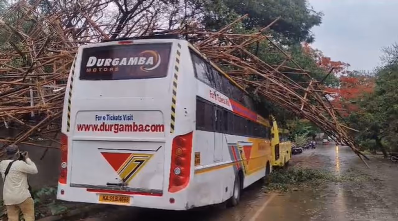 ತಪ್ಪಿದ ಭಾರೀ ಅನಾಹುತ; ಬಿರುಗಾಳಿ ಸಹಿತ ಭಾರೀ ಮಳೆಗೆ ಬಸ್ ಮೇಲೆ ಕಳಚಿಬಿದ್ದ ಕಟ್ಟಿಗೆಗಳು!