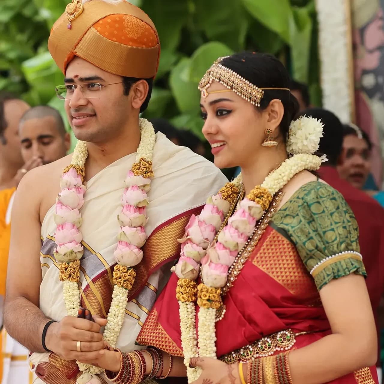 ತಮ್ಮ ಮದುವೆ ಬಗ್ಗೆ ಮೊದಲ ಬಾರಿಗೆ ಸಾಮಾಜಿಕ ಜಾಲತಾಣದಲ್ಲಿ ಅಧಿಕೃತ ಪೋಸ್ಟ್ ಹಂಚಿಕೊಂಡಿರುವ ಸಂಸದ ತೇಜಸ್ವಿ ಸೂರ್ಯ 'ಗುರುಗಳು, ಹಿರಿಯರು ಮತ್ತು ಹಿತೈಷಿಗಳ ಆಶೀರ್ವಾದದೊಂದಿಗೆ ಇಂದು ವೈದಿಕ ಸಂಪ್ರದಾಯಗಳ ಪ್ರಕಾರ ಶಿವಶ್ರೀ ಸ್ಕಂದಪ್ರಸಾದ್ ಅವರನ್ನು ವಿವಾಹವಾಗಿದ್ದೇನೆ. ಈ ಹೊಸ ಅಧ್ಯಾಯವನ್ನು ಪ್ರಾರಂಭಿಸುವಾಗ ನಿಮ್ಮ ಆಶೀರ್ವಾದ ಮತ್ತು ಶುಭಾಶಯಗಳನ್ನು ನಾವು ಬಯಸುತ್ತೇವೆ' ಎಂದು ತಿಳಿಸಿದ್ದಾರೆ.