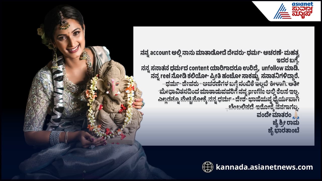 ಆದರೆ ಇತ್ತೀಚೆಗೆ ಯಾರೋ ನಟಿಯ ಆಧ್ಯಾತ್ಮಿಕ ಹಾಗೂ ಸನಾತನ ಧರ್ಮಕ್ಕೆ ಸಂಬಂಧಿಸಿದಂತಹ ಕಂಟೆಂಟ್ ಹಾಗೂ ರೀಲ್ಸ್ ಗಳಿಗೆ ಕೆಟ್ಟದಾಗಿ ಕಾಮೆಂಟ್ ಮಾಡಿದಂತೆ. ನಟಿ ತಮ್ಮ ಕಂಟೆಂಟ್ ವಿರುದ್ಧ ಮಾತನಾಡಿದವರಿಗೆ ಖಡಕ್ ಆಗಿ ವಾರ್ನಿಂಗ್ ಕೊಟ್ಟಿದ್ದು, ಅದನ್ನು ತಮ್ಮ ಸೋಶಿಯಲ್ ಮಿಡಿಯಾದಲ್ಲಿ ಹಂಚಿಕೊಂಡಿದ್ದಾರೆ.