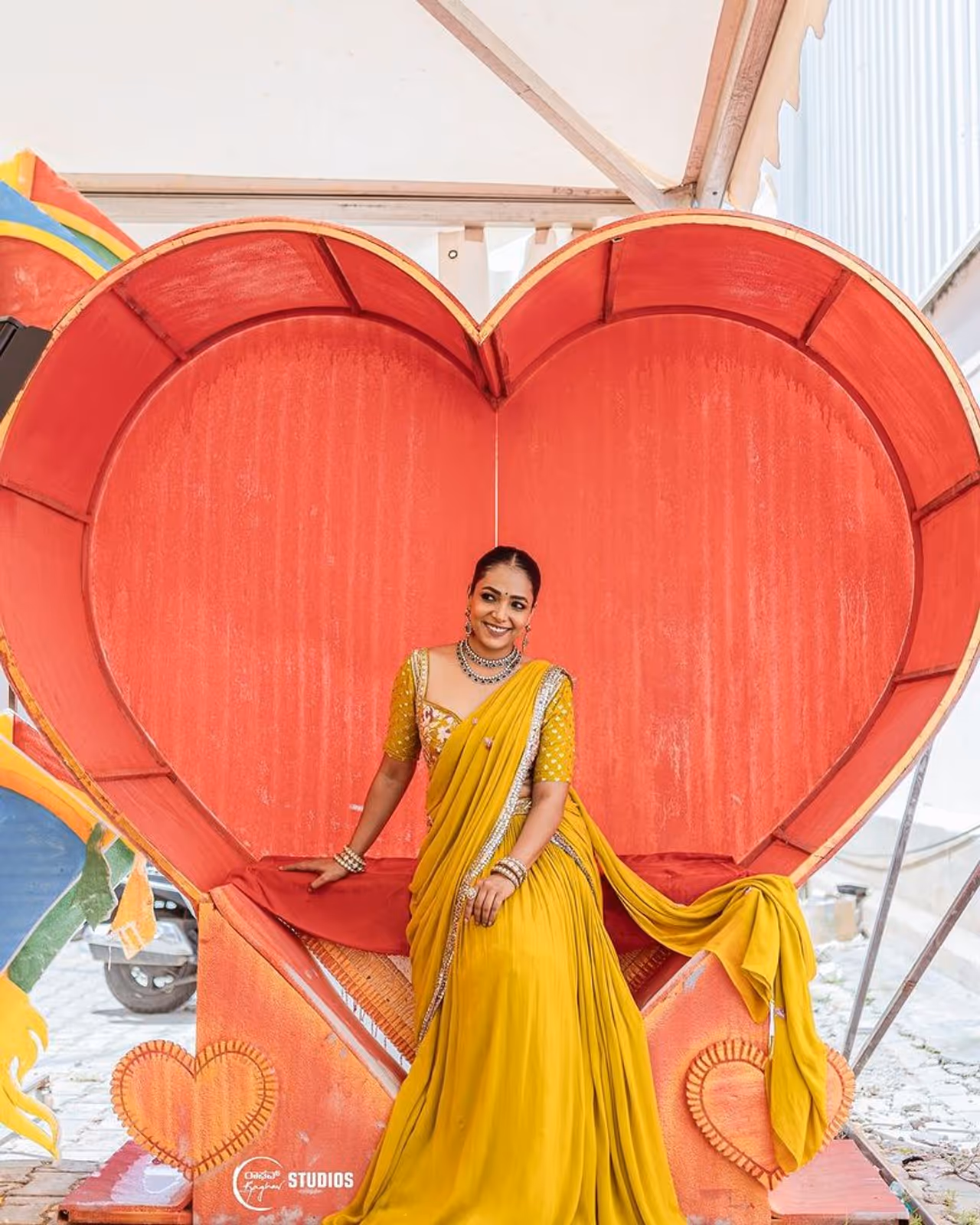 ಅನುಪಮಾ ಗೌಡ, ಯೆಲ್ಲೋ ಸೀರೆಯುಟ್ಟು ಕಂಗೊಳಿಸಿದ್ದಾರೆ. ಇದಕ್ಕೆ ಸುಂದರವಾದ ನೆಕ್ಲೇಸ್ ಸೆಟ್ ಹಾಕ್ಕೊಂಡು ಕಪ್ಪು ಬಿಂದಿಯನ್ನು ಹಣೆಗೆ ಇಟ್ಟುಕೊಂಡಿದ್ದಾರೆ. ಮುಖದ ಮೇಲೆ ಹಾರುವ ಮುಂಗುರುಳಿನ ಜೊತೆ ಅನುಪಮಾ ತುಂಬಾ ಅದ್ಭುತವಾಗಿ ಕಾಣಿಸುತ್ತಿದ್ದಾರೆ.