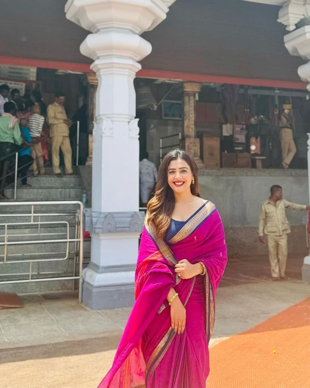 ಗುಲಾಬಿ ಬಣ್ಣದ ಸೀರೆ ಜೊತೆಗೆ ನೀಲಿ ಬಣ್ಣದ ಬ್ಲೌಸ್ ಧರಿಸಿರುವ ಸಾರಾ,ಇತಿಹಾಸ ಪ್ರಸಿದ್ಧ ಧರ್ಮಸ್ಥಳ ದೇಗುಲದ ಎದುರು ಮತ್ತು ಸೌತಡ್ಕ ಗಣಪತಿ (Sauthadka Ganapathi temple) ದೇಗುಲದ ಎದುರು ನಿಂತು ವಿವಿಧ ರೀತಿಯ ಪೋಸ್ ಕೊಟ್ಟು ಫೋಟೊ ತೆಗೆದುಕೊಂಡಿದ್ದು, ತಮ್ಮ ಸೋಶಿಯಲ್ ಮೀಡಿಯಾದಲ್ಲಿ ಹಂಚಿಕೊಂಡಿದ್ದಾರೆ.