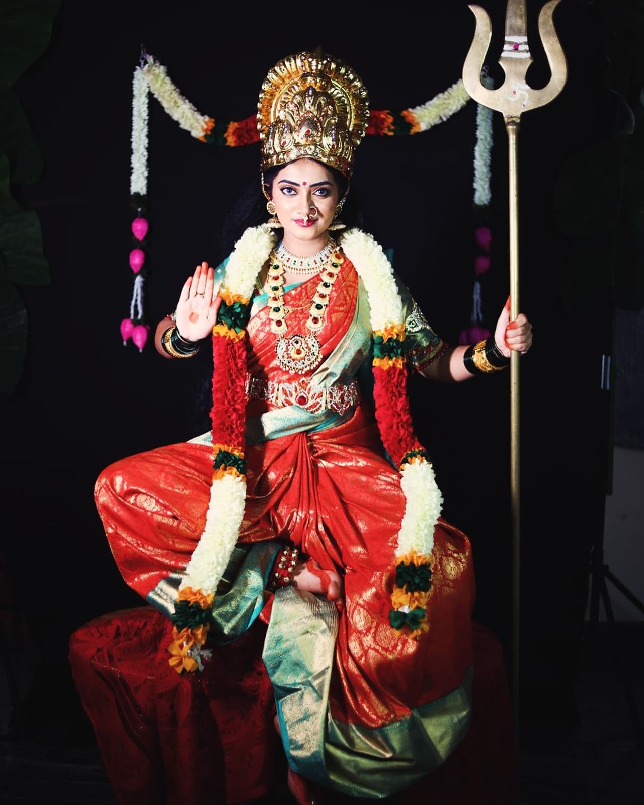 ಈ ಫೋಟೊದಲ್ಲಿ ಸಾಕ್ಷಾತ್ ದೇವಿಯ ಅವತಾರದಲ್ಲಿ ಕಾಣಿಸಿಕೊಂಡಿದ್ದು ಯಾರು ಅನ್ನೋದು ಗೊತ್ತಾಯ್ತ? ಇಷ್ಟರಲ್ಲಾಗಲೇ ಗೊತ್ತಾಗಲೇ ಬೇಕು ಅಲ್ವಾ? ಸಾಕ್ಷಾತ್ ದೇವಿಯಾಗಿ ಕಾಣಿಸಿಕೊಂಡಿದ್ದು, ಬೇರಾರು ಅಲ್ಲ ಕನ್ನಡ ಕಿರುತೆರೆ, ಹಿರೆತೆರೆಯಲ್ಲಿ ಮಿಂಚುತ್ತ್ರಿರುವ ನಟಿ ರಾಧಾ ಭಗವತಿ (Radha Bhagavati).