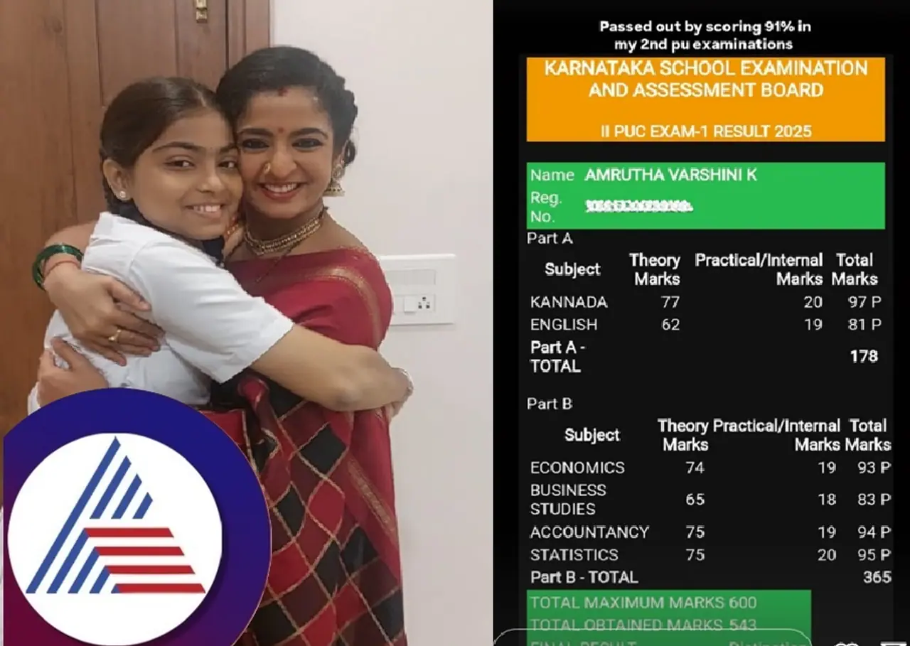 ಇದೀಗ ದ್ವಿತೀಯ ಪಿಯುಸಿ ರಿಸಲ್ಟ್ ಬಂದಿದ್ದು, ಪಿಯುಸಿಯಲ್ಲಿ ವಾಣಿಜ್ಯ ವಿದ್ಯಾರ್ಥಿನಿಯಾಗಿರುವ ಅಮೃತ ಗೌಡ (Amrutha Gowda) 600ಕ್ಕೆ 543 ಅಂಕ ಗಳಿಸಿ, ಡಿಸ್ಟಿಂಕ್ಷನ್ ನಲ್ಲಿ ಪಾಸ್ ಆಗಿದ್ದಾರೆ. ತಮ್ಮ ಮಾರ್ಕ್ ಲಿಸ್ಟನ್ನು ಸೋಶಿಯಲ್ ಮೀಡಿಯಾದಲ್ಲಿ ಹಂಚಿಕೊಂಡಿದ್ದಾರೆ.