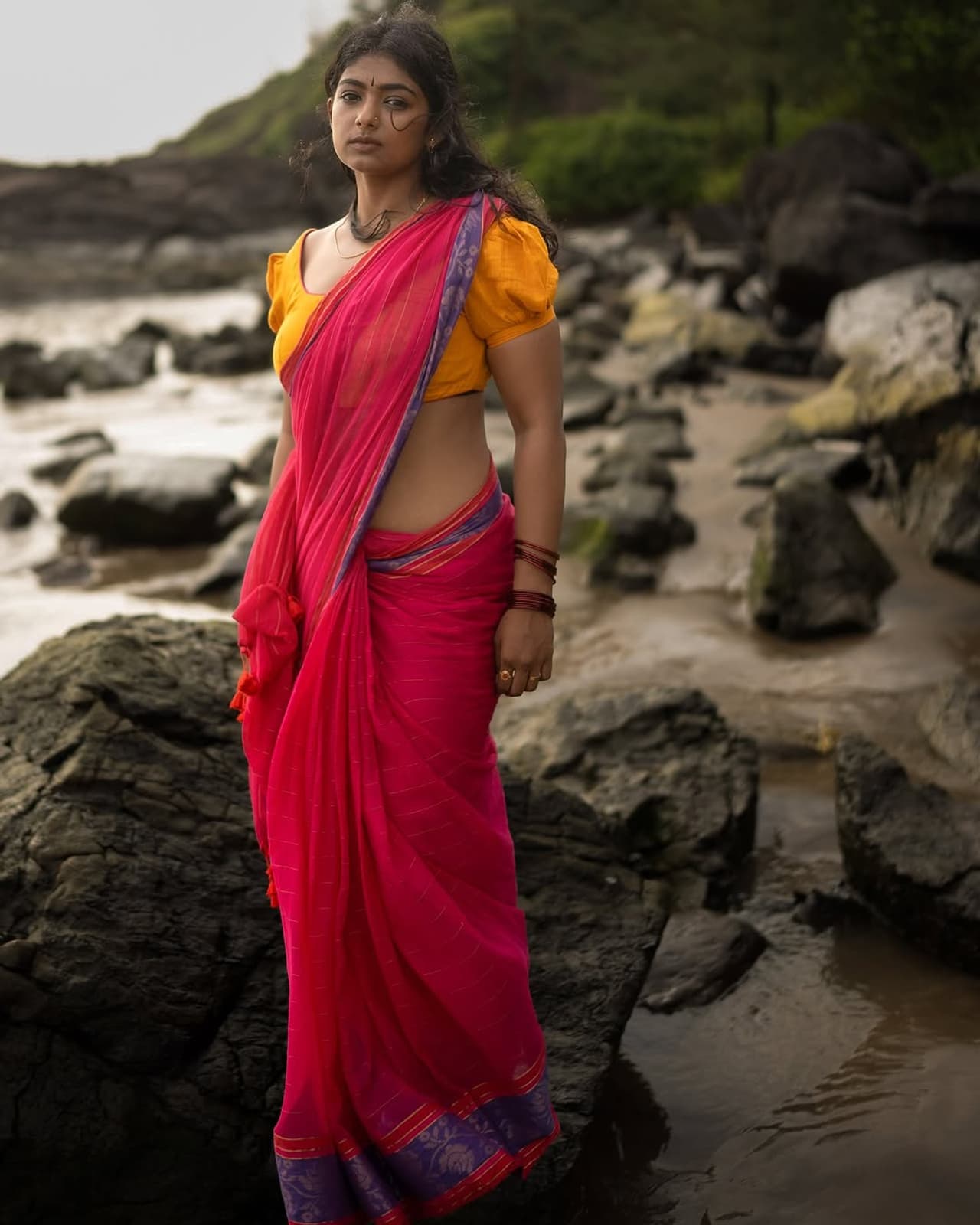 ಭೂಮಿ ಶೆಟ್ಟಿಯ ಸೊಗಸಾದ ಸೀರೆ ಲುಕ್ ಹೇಗೆ ಕಾಣಿಸ್ತಿದೆ ಅಂದ್ರೆ, ಅದು ಸಿನಿಮ್ಯಾಟಿಕ್ ಫೀಲ್ ನೀಡುತ್ತಿದೆ, ಅಂದ್ರೆ ಭೂಮಿ ಈಗಷ್ಟೇ ಸಿನಿಮಾ ಒಂದರ ದೃಶ್ಯದಿಂದ ಹೊರಬಂದಂತೆ ಕಾಣುತ್ತಾಳೆ. ಅಷ್ಟೊಂದು ಸುಂದರವಾಗಿವೆ ಫೋಟೊಗಳು.