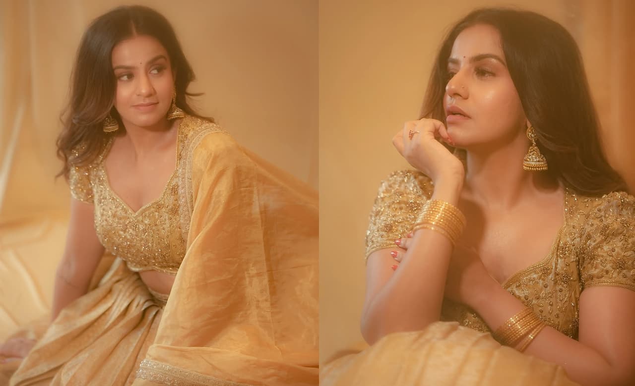 ಹೊಸ ಫೋಟೋಶೂಟ್ ಮಾಡಿಸಿರೋ ನಮ್ರತಾ ಗೋಲ್ಡನ್ ಕಲರ್ ಲೆಹೆಂಗಾ ತೊಟ್ಟಿದ್ದು, ಅದಕ್ಕೆ ಒಪ್ಪುವ ಹಾಗೆ ಗೋಲ್ಡನ್ ಬಣ್ಣದ ಬ್ಯಾಂಗಲ್ ತೊಟ್ಟಿದ್ದಾರೆ. ಈ ಲುಕ್ನಲ್ಲಿ ನಮ್ರತಾ ಚಿನ್ನದ ಗೊಂಬೆ ತರ ಕಾಣ್ತಿದ್ದಾರೆ.
