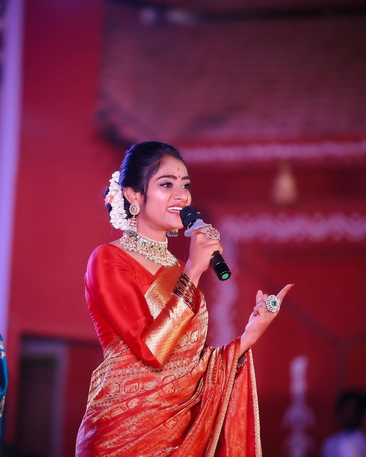 ಸೀರೆ ಜೊತೆ ತಲೆಗೂದಲಿಗೆ ಸಂಗೀತಾ ಮಲ್ಲಿಗೆ ಮುಡಿದಿದ್ದರು. ಇದರ ಜೊತೆಗೆ ಹಸಿರು ಹರಳಿನ ಗ್ರ್ಯಾಂಡ್ ಇಯರಿಂಗ್ಸ್, ನೆಕ್ಲೆಸ್ ಹಾಗೂ ಉಂಗುರವನ್ನು ಧರಿಸಿದ್ದರು. ಇದು ಅವರಿಗೆ ತುಂಬಾ ಸಖತ್ತಾಗಿ ಕಾಣಿಸಿದೆ. ರೆಡ್ ಜೊತೆ ಗ್ರೀನ್ ಹರಳಿನ ಜ್ಯುವೆಲ್ಸ್ ಸಖತ್ ಆಗಿ ಮ್ಯಾಚಿಂಗ್ ಆಗಿತ್ತು.