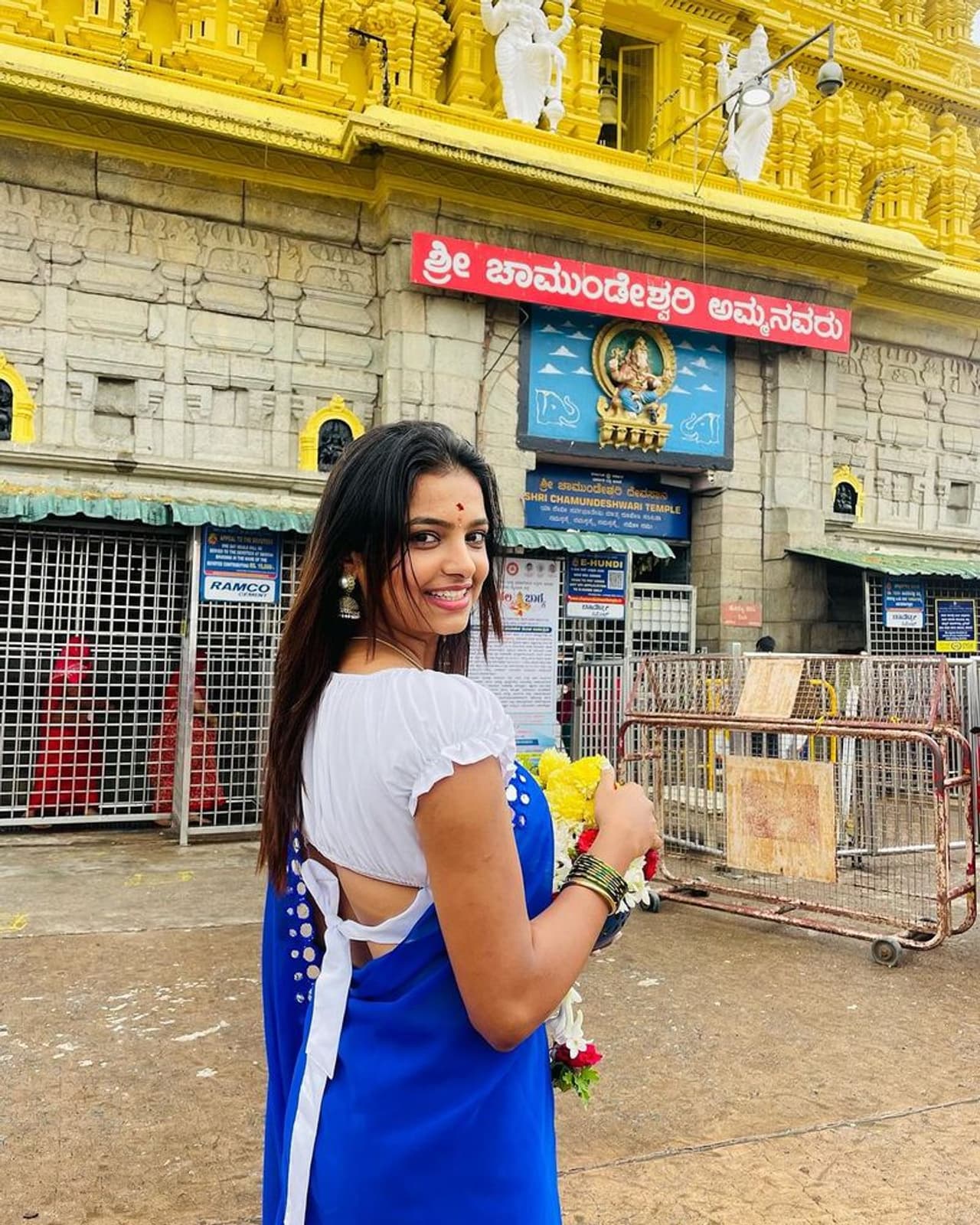 ಇದೀಗ ಸೋನು ಗೌಡ ನೀಲಿ ಸೀರೆಯುಟ್ಟು, ಕೈಯಲ್ಲಿ ಪೂಜಾ ಸಾಮಾಗ್ರಿಗಳನ್ನು ಹಿಡಿದುಕೊಂಡಿದ್ದಾರೆ. ಹೌದು! ಸೋನು ಗೌಡ ಕೂಡ ಮೈಸೂರಿನ ಚಾಮುಂಡಿ ಬೆಟ್ಟಕ್ಕೆ ಭೇಟಿ ನೀಡಿರುವ ಫೋಟೋಗಳನ್ನು ಸೋಶಿಯಲ್ ಮೀಡಿಯಾದಲ್ಲಿ ಹಂಚಿಕೊಂಡಿದ್ದಾರೆ.