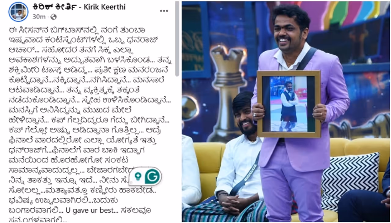 "ಈ ಸೀಸನ್ನ ಬಿಗ್ಬಾಸ್ನಲ್ಲಿ ನಂಗೆ ತುಂಬಾ ಇಷ್ಟವಾದ ಕಂಟೆಸ್ಟೆಂಟ್ಗಳಲ್ಲಿ ಒಬ್ಬ ಧನರಾಜ್ ಆಚಾರ್. ಸಹೋದರ ತನಗೆ ಸಿಕ್ಕ ಎಲ್ಲಾ ಅವಕಾಶಗಳನ್ನು ಅದ್ಭುತವಾಗಿ ಬಳಸಿಕೊಂಡ. ತನ್ನ ಶಕ್ತಿಮೀರಿ ಟಾಸ್ಕ್ ಆಡಿದ್ದ. ಪ್ರತೀ ಕ್ಷಣ ಮನರಂಜನೆ ಕೊಟ್ಟಿದ್ದಾನೆ. ನಕ್ಕಿದ್ದಾನೆ. ನಗಿಸಿದ್ದಾನೆ. ಮನಸಾರೆ ಆಟವಾಡಿದ್ದಾನೆ. ತನ್ನ ವ್ಯಕ್ತಿತ್ವಕ್ಕೆ ತಕ್ಕಂತೆ ನಡೆದುಕೊಂಡಿದ್ದಾನೆ. ಸ್ನೇಹ ಉಳಿಸಿಕೊಂಡಿದ್ದಾನೆ. ಮನಸ್ಸಿಗೆ ಅನಿಸಿದ್ದನ್ನು ಮುಖದ ಮೇಲೆ ಹೇಳಿದ್ದಾನೆ. ಕಪ್ ಗೆಲ್ಲದಿದ್ದರೂ ಗೆದ್ದು ಬೀಗಿದ್ದಾನೆ. ಕಪ್ ಗೆಲ್ಲೋ ಅಷ್ಟು ಆಡಿದ್ದಾನಾ ಗೊತ್ತಿಲ್ಲ. ಆದ್ರೆ ಫಿನಾಲೆ ವಾರದಲ್ಲಿರೋ ಎಲ್ಲಾ ಯೋಗ್ಯತೆ ಇತ್ತು ಧನ್ರಾಜ್ಗೆ. ಫಿನಾಲೆಗೆ ವಾರ ಬಾಕಿ ಇದ್ದಾಗ ಮನೆಯಿಂದ ಹೊರಹೋಗೋ ಸಂಕಟ ಸಾಮಾನ್ಯವಾದುದ್ದಲ್ಲ. ಬೇಜಾರಗಬೇಡ ತಮ್ಮ. ನಿನ್ನ ತಾಕತ್ತು ಇನ್ನೂ ಇದೆ. ನೀನು ಸೋತಿಲ್ಲ. ಸೋಲಲ್ಲ. ಮತ್ಯಾವತ್ತೂ ಕಣ್ಣೀರು ಹಾಕಬೇಡ. ಭವಿಷ್ಯ ಉಜ್ವಲವಾಗಿರಲಿ. ಬದುಕು ಬಂಗಾರವಾಗಲಿ. U gave ur best. ಸಕಲವೂ ಸನ್ಮಂಗಳವಾಗಲಿ." -ಕಿರಿಕ್ ಕೀರ್ತಿ