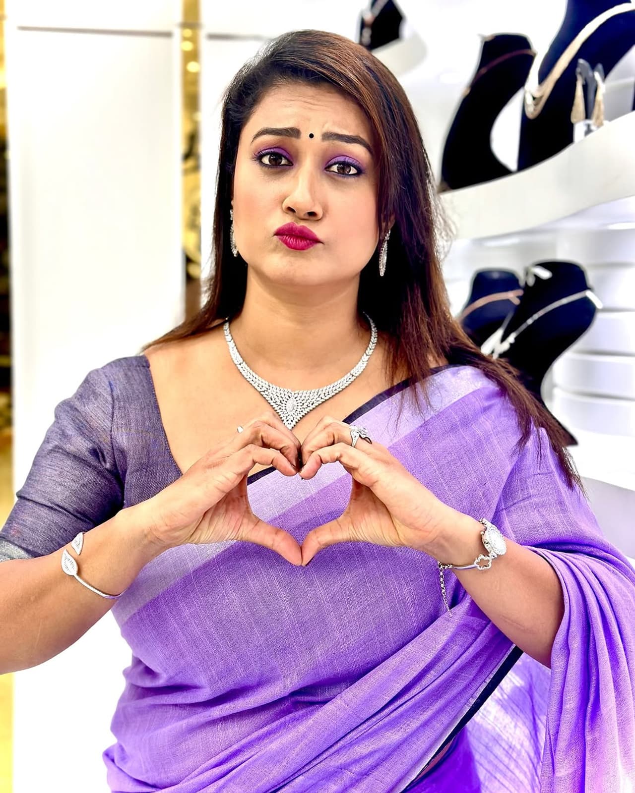 ನೇರಳೆ ಬಣ್ಣದ ಸೀರೆಯಲ್ಲಿ ಕೋರಿಯನ್ ಹಾರ್ಟ್ ಮತ್ತು ನಾರ್ಮಲ್ ಹಾರ್ಟ್ ಫೋಸ್ ಕೊಟ್ಟಿದ್ದಾರೆ. ನಿಮ್ಮ ಹಾರ್ಟ್ ದೊಡ್ಡದು ಮೇಡಂ ಎಂದು ಫ್ಯಾನ್ಸ್ ಕಾಮೆಂಟ್ ಮಾಡಿದ್ದಾರೆ.