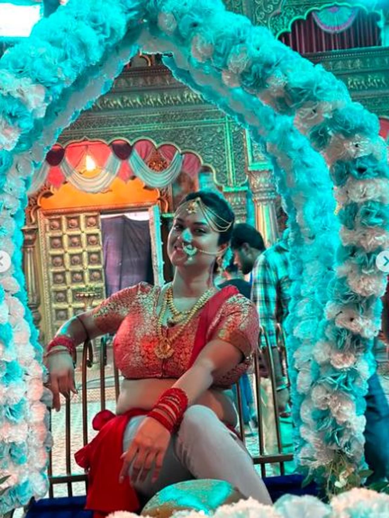 ಕೆಂಪು ಬಣ್ಣದ ಬ್ಲೌಸ್ಗೆ ನೀಲಿ ಬಣ್ಣ ಜೀನ್ಸ್ ಪ್ಯಾಂಟ್ ಧರಿಸಿದ್ದಾರೆ. ಕೈ ತುಂಬಾ ಕೆಂಪು ಬಳೆ ಹಾಗೂ ಸೀರೆಗೆ ಧರಿಸುವಂತೆ ಆಭರಣಗಳಲ್ಲಿ ತನಿಷಾ ಮಿಂಚಿದ್ದಾರೆ.