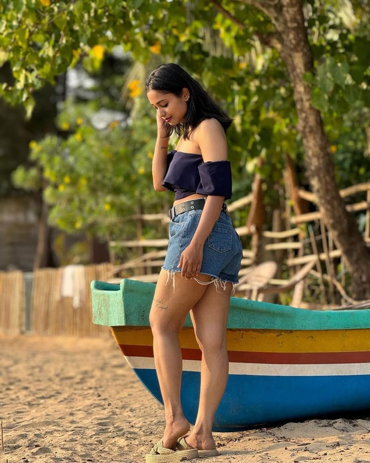 ಕಪ್ಪು ಬಣ್ಣದ ಆಫ್ ಶೋಲ್ಡರ್ ಕ್ರಾಪ್ ಟಾಪ್, ಡೆನಿಮ್ ಬಮ್ ಶಾರ್ಟ್ ಧರಿಸಿರುವ ಅಮೂಲ್ಯ ತುಂಬಾನೆ ಹಾಟ್ ಆಗಿ ಕಾಣಿಸ್ತಿದ್ದಾರೆ. ಬೃಂದಾವನದ (Brundavana) ಪುಷ್ಪಾಗೂ, ರಿಯಲ್ ಲೈಫ್ ಅಮೂಲ್ಯಗೂ ತುಂಬಾನೆ ವ್ಯತ್ಯಾಸ ಇದೆ.