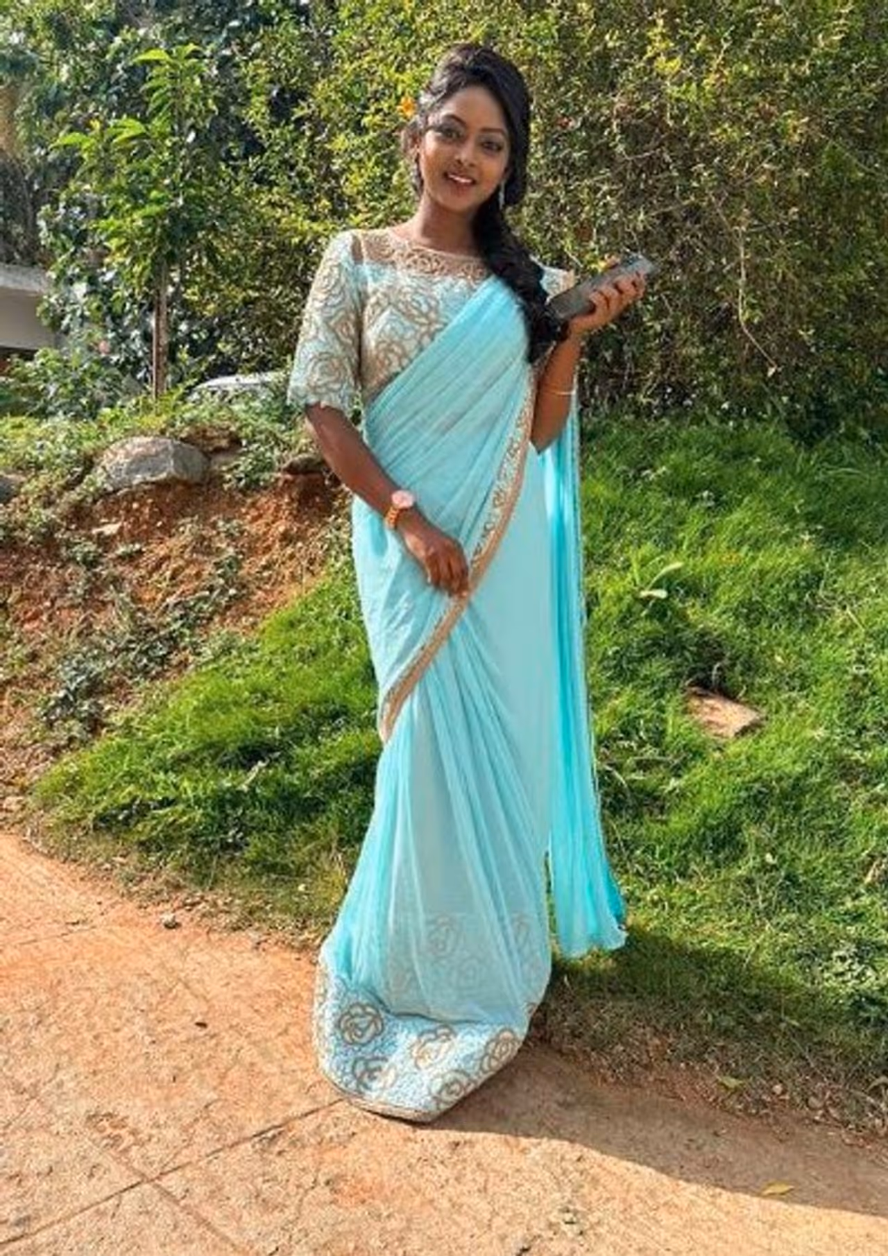 ನಿಯಾನ್ ಬ್ಲೂ ಸೀರೆಗೆ ಗೋಲ್ಡ್ ಡಿಸೈನರ್ ಬಾರ್ಡರ್ ಇದೆ. ಬ್ಲೌಸ್ಗೂ ಕೂಡ ಸಂಪೂರ್ಣವಾಗಿ ಗೋಲ್ಡ್ ಬಣ್ಣದಲ್ಲಿ ವರ್ಕ್ ಇದೆ.