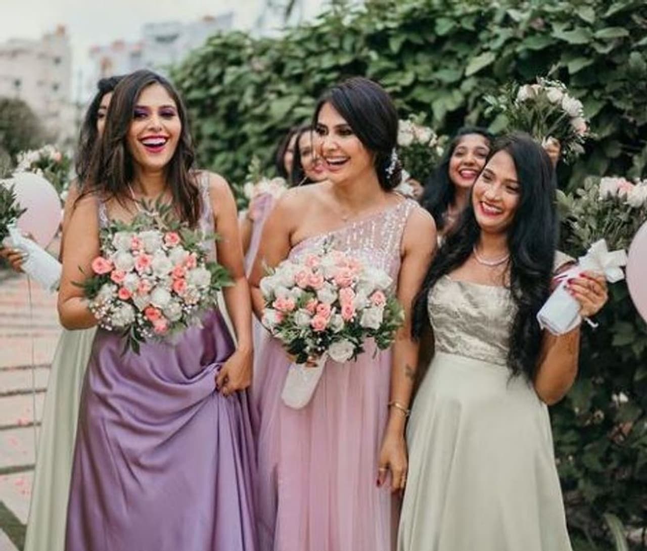 ಈ ಪಾರ್ಟಿಯಲ್ಲಿ ವಧು ಸ್ನೇಹಿತರು ಗ್ರೀನ್ ಬಣ್ಣದ ಉಡುಪು ಧರಿಸಿದ್ದಾರೆ ಹಾಗೂ ಸಹೋದರಿ ಪರ್ಪಲ್ ಬಣ್ಣದ ಗೌನ್ ಧರಿಸಿದ್ದಾರೆ.