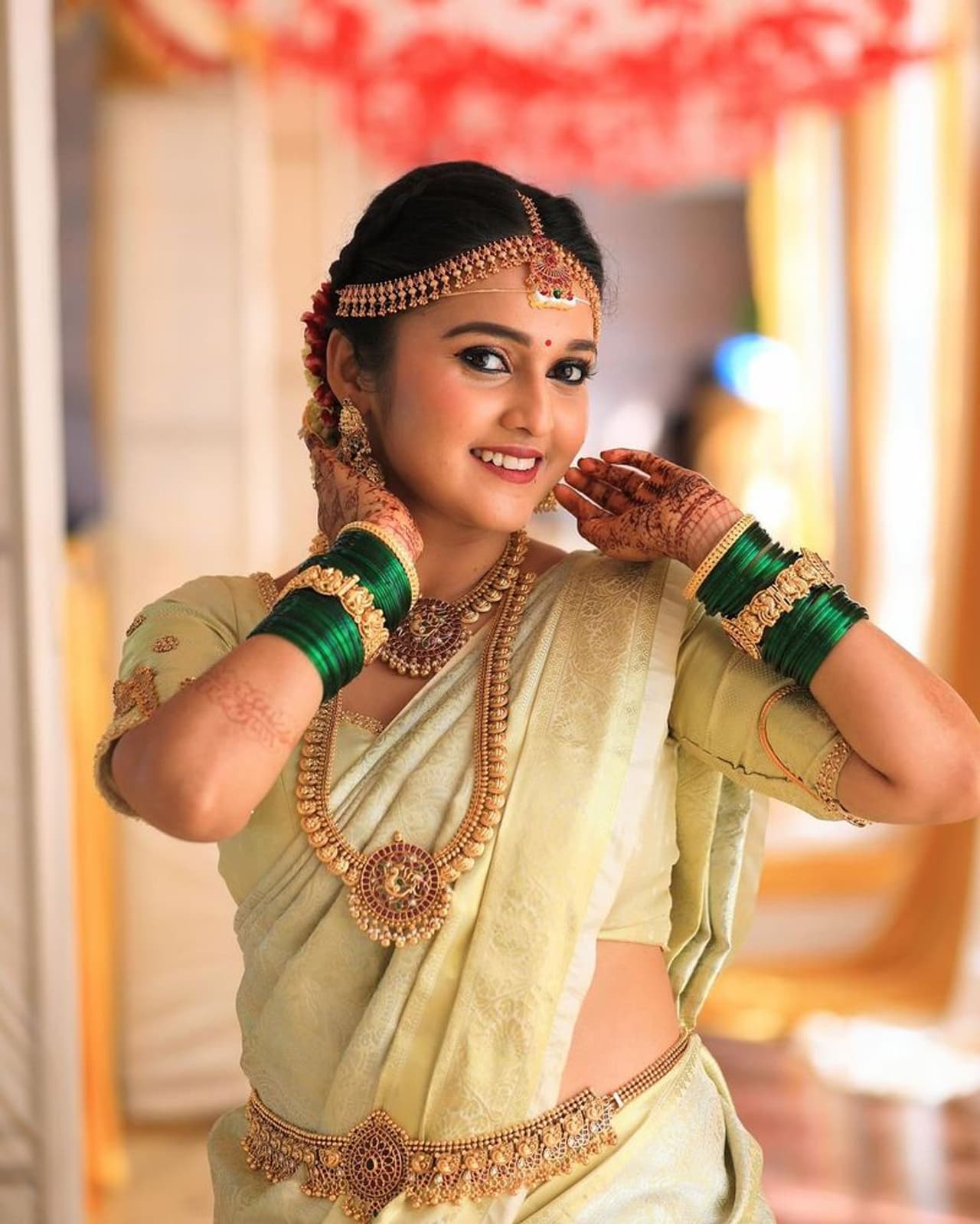 ಸ್ಟೈಲಿಸ್ಟ್ ಚಂದನ್ ಗೌಡ ಅವರ ರೆಂಟ್ ಯುರ್ ಲುಕ್ ನಿಂದ ಪಡೆದಂತಹ ಬಿಳಿ ಬಣ್ಣದ ಲೆಹೆಂಗಾಕ್ಕೆ, ಹಸಿರು, ಕೆಂಪು, ಹಳದಿ ಬಣ್ಣದ ಡೀಸೈನ್ ಇರುವ ಬಾರ್ಡರ್ ಇದ್ದು, ಕೈತುಂಬಾ ಬಳೆ, ಮೂಗಿಗೆ ದೊಡ್ಡದಾದ ನತ್ತು ಧರಿಸಿ, ವೈಟ್ ಬ್ಯಾಕ್ ಗ್ರೌಂಡ್ ನಲ್ಲಿ ಸುಂದರವಾಗಿ ಕಾಣಿಸಿಕೊಂಡಿದ್ದಾರೆ.