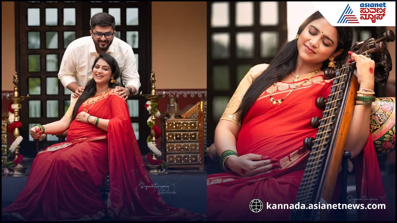 ರಶ್ಮಿ ಪ್ರಭಾಕರ್ ಕೆಂಪು ಬಣ್ಣದ ಸೀರೆಯುಟ್ಟು, ಕೈಯಲ್ಲಿ ವೀಣೆ ಹಿಡಿದು, ಮತ್ತೊಂದು ಕೈಯಲ್ಲಿ ಬೇಬಿ ಬಂಪ್ ಮೇಲೆ ಇರಿಸಿದರೆ, ಪತಿ ನಿಖಿಲ್ ಬಿಳಿ ಬಣ್ಣದ ಪಂಚೆ, ಶರ್ಟ್ ಧರಿಸಿ, ಹೆಂಡ್ತಿ ಜೊತೆ ಪೋಸ್ ಕೊಟ್ಟಿದ್ದಾರೆ.