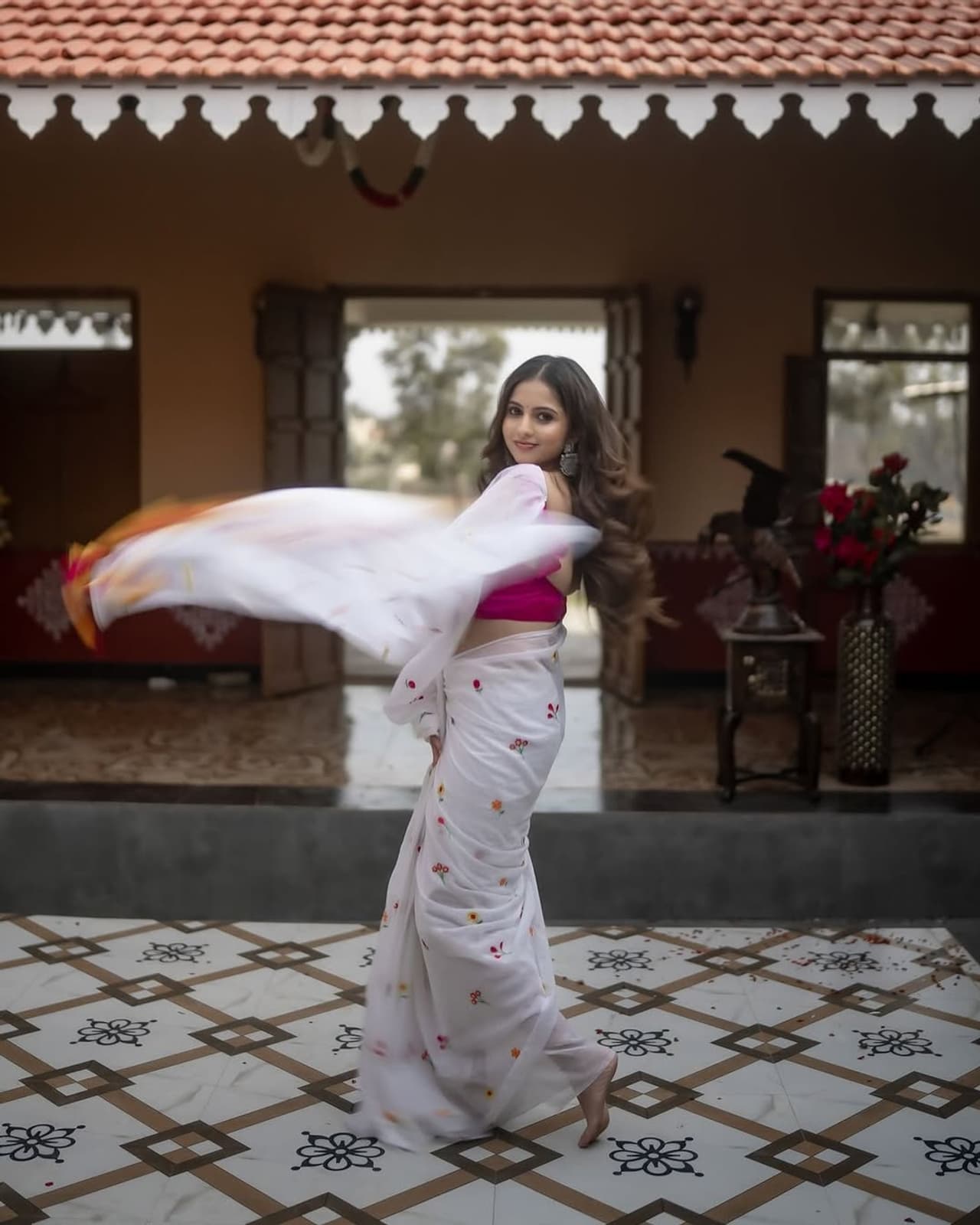 ನಿವೇದಿತಾ ಬಿಳಿ ಬಣ್ಣದ ಟ್ರಾನ್ಸ್ಪರೆಂಟ್ ಸೀರೆ ಮೇಲೆ , ಕೆಂಪು ಹಳದಿ ಬಣ್ಣದ ಪ್ಲೋರಲ್ ಪ್ರಿಂಟ್ ಇದೆ. ಇದಕ್ಕೆ ಮ್ಯಾಚ್ ಆಗುವಂತೆ ನಿವ್ವಿ, ಕೆಂಪು ಬಣ್ಣದ ಸುಂದರವಾದ ಸ್ಲೀವ್ ಲೆಸ್ ಬ್ಲೌಸ್ ಧರಿಸಿದ್ದಾರೆ. ಜೊತೆಗೆ ಪುಟ್ಟದಾದ ಬಿಂದಿ ಕೂಡ ಇಟ್ಟಿದ್ದಾರೆ. ಈ ಲುಕ್ ನಲ್ಲಿ ನಿವೇದಿತಾ ಕ್ಯೂಟ್ ಆಗಿ ಕಾಣಿಸ್ತಿದ್ದಾರೆ.