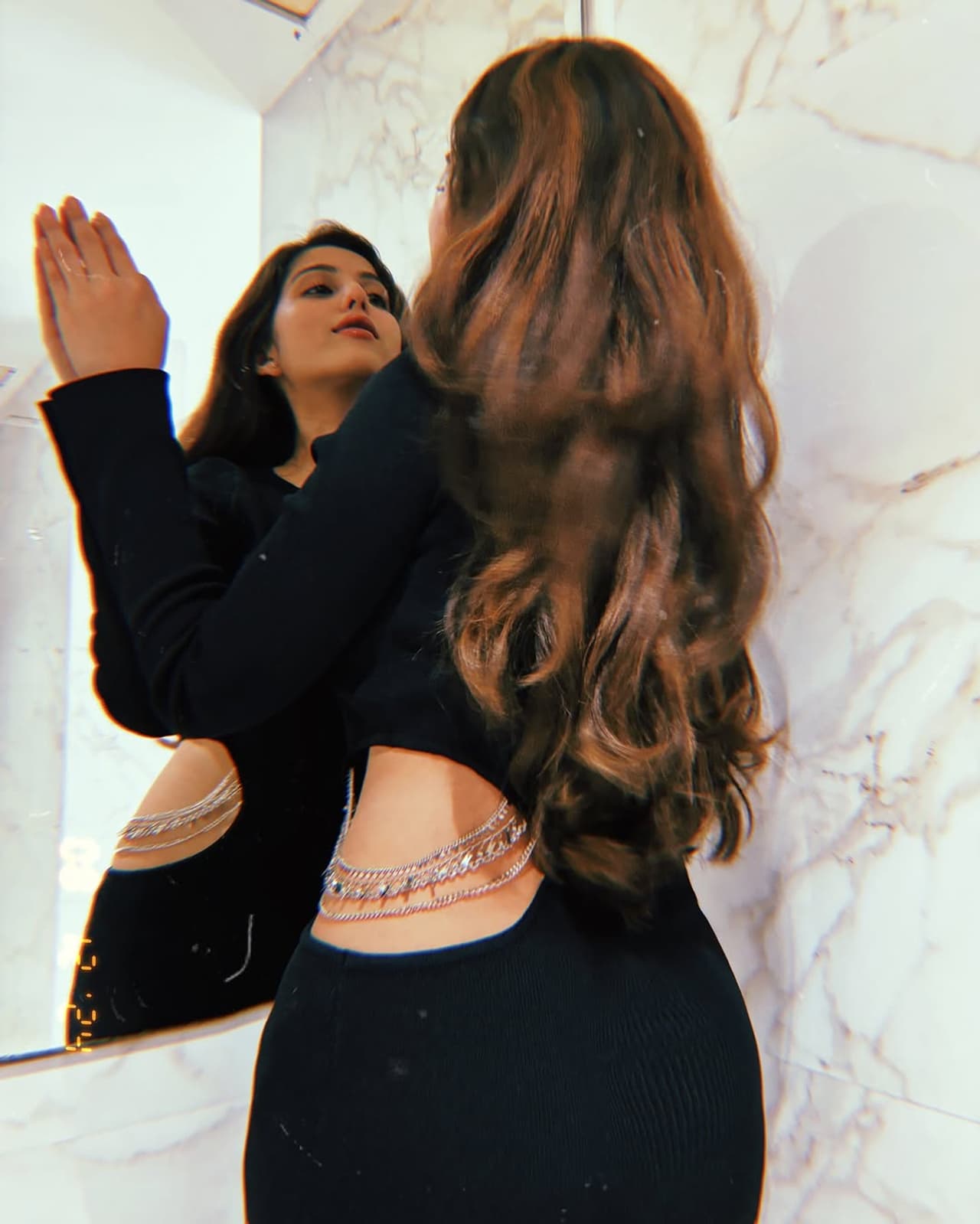 ಗೆಳತಿ ಜೊತೆ ಕ್ಲಿಕ್ಕಿಸಿಕೊಂಡಿರುವ ಫೋಟೋಗಳನ್ನು ನಿವೇದಿತಾ ಹಂಚಿಕೊಂಡಿದ್ದಾರೆ. ಕನ್ನಡಿ ಮುಂದೆ ನಿಂತು ತಮ್ಮನ್ನೇ ಮರೆತ ಹಾಗೆ ರೀತಿಯಲ್ಲಿ ಕ್ಯಾಮೆರಾಗೆ ಪೋಸ್ ಕೊಟ್ಟು ಫೋಟೋ ಕ್ಲಿಕ್ಕಿಸಿಕೊಂಡಿದ್ದಾರೆ. ಇದರ ಜೊತೆ ಸೊಂಟದ ಮೇಲೆ ಮೂರು ಎಳೆಯುಳ್ಳ ಸರ ಇರೋದನ್ನು ಝೂಮ್ ಮಾಡಿದ್ದಾರೆ.