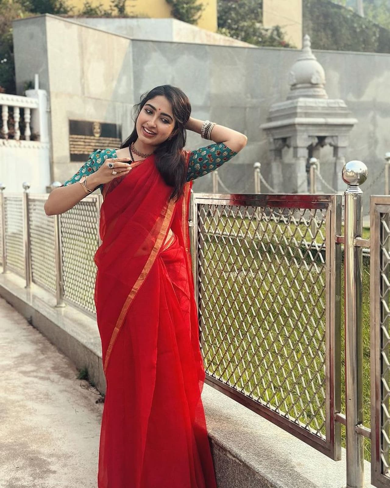 ಕೆಂಪು ಬಣ್ಣದ ಸೀರೆಯುಟ್ಟಿರುವ ಸಾನ್ಯಾ, ಅದಕ್ಕೆ ಮ್ಯಾಚ್ ಆಗುವ ಗ್ರೀನ್ ಬ್ಲೌಸ್ ಧರಿಸಿದ್ದಾರೆ. ತುಂಬಾ ಮುದ್ದಾಗಿ ಕಾಣಿಸುತ್ತಿರುವ ನಟಿಗೆ, ಅಭಿಮಾನಿಗಳು ಸಹ ತಮ್ಮ ಮೆಚ್ಚಿನ ನಟಿಯ ಲುಕ್ಗೆ ಫಿದಾ ಆಗಿದ್ದಾರೆ.