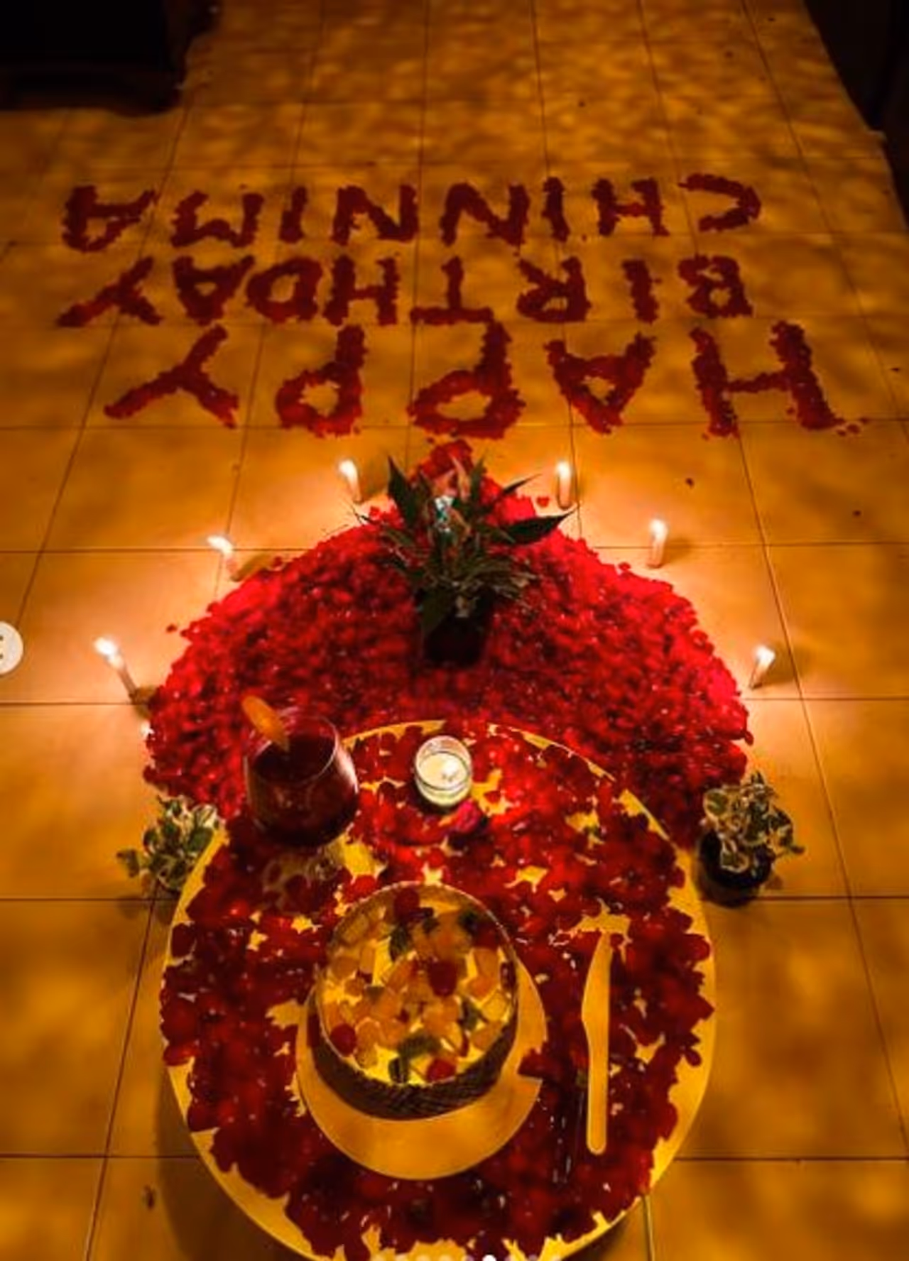 ಹಣ್ಣುಗಳಿಂದ ಮಾಡಿಸಿರುವ ಬರ್ತಡೇ ಕೇಕ್ನ ಹೂಗಳಿಂದ ಅಲಂಕಾರ ಮಾಡಿ, ಇಡೀ ರೂಮಿನ ನೆಲವನ್ನು ಅದ್ಧೂರಿಯಾಗಿ ಅಲಂಕಾರ ಮಾಡಿದ್ದಾರೆ.