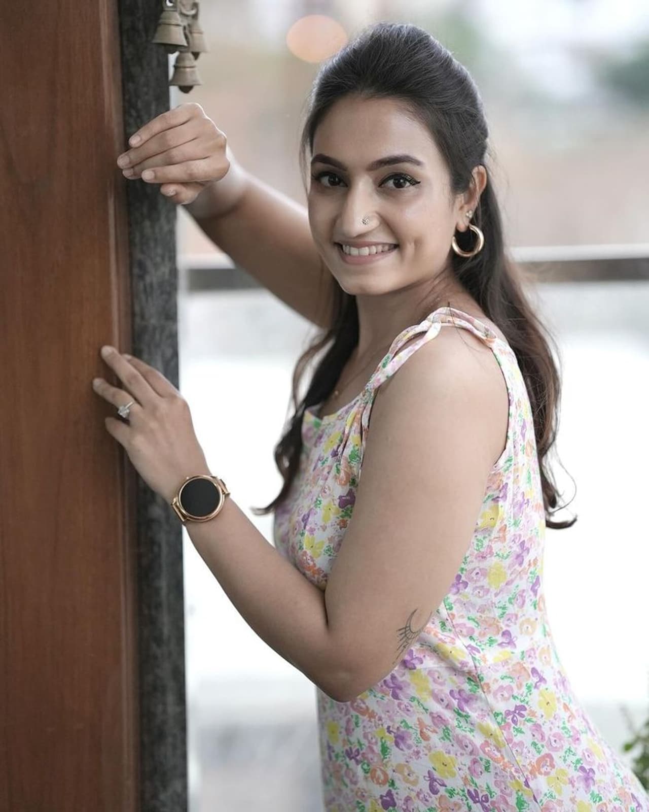 ಬಿಳಿ ಬಣ್ಣದ ಸ್ಲೀವ್ ಲೆಸ್ ಡ್ರೆಸ್ ಮೇಲೆ ನೇರಳೆ, ಹಳದಿ, ಹಸಿರುವ ಬಣ್ಣದ ಪ್ಲೋರಲ್ ಡಿಸೈನ್ (floral dress) ಇರುವಂತಹ ಆರಾಮದಾಯಕ ಸಮ್ಮರ್ ಡ್ರೆಸ್ ನಲ್ಲಿ ವೈಷ್ಣವಿ ಮಿಂಚಿದ್ದಾರೆ. ಎಂದಿನಂತೆ ತಮ್ಮ ಸಿಂಪಲ್ ಲುಕ್, ಡಿಂಪಲ್ ಕಾಣಿಸುವಂತೆ ನಗುವ ಮುದ್ದಾದ ಹೂನಗುವನ್ನು ಚೆಲ್ಲಿದ್ದಾರೆ.