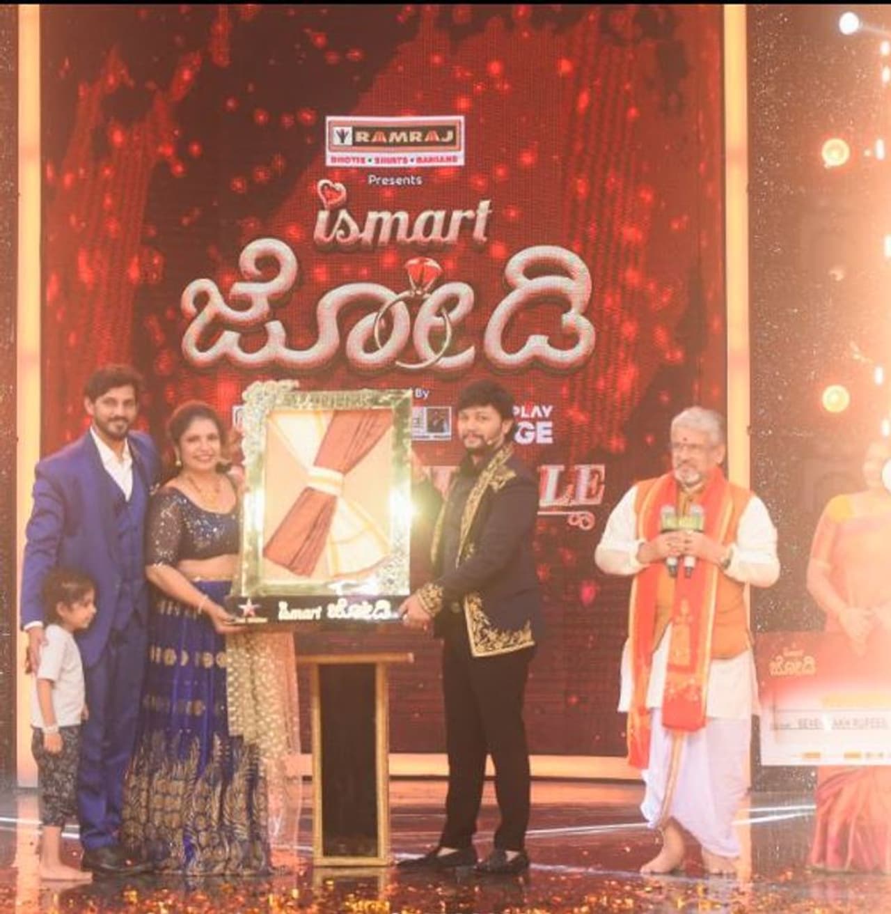 ರೇಶ್ಮೆ ಸೀರೆ ಮತ್ತು ಪಂಚೆ ಇರುವ ಇಸ್ಮಾರ್ಟ್ ಜೋಡಿ ಟ್ರೋಫಿ, 7 ಲಕ್ಷ ಹಣದ ಚೆಕ್ ಮತ್ತು ಇಬ್ಬರ ಹೆಜ್ಜೆ ಗುರುತು. ಫೋಟೋಗಳನ್ನು ಪುನೀತಾ ಸೋಷಿಯಲ್ ಮೀಡಿಯಾದಲ್ಲಿ ಶೇರ್ ಮಾಡಿಕೊಂಡಿದ್ದಾರೆ.