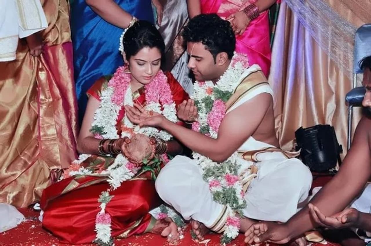 ಪಂಚೆ, ಶಲ್ಯ ಜೊತೆಗೆ ಹಣೆ ಮೇಲೆ ಮೂರು ನಾಮ ಹಾಕಿದ ಹುಡುಗ, ಕೆಂಪು ಸೀರೆಯಲ್ಲಿ ಸಿಂಪಲ್ ಆಗಿ ರೆಡಿಯಾಗಿರುವ ವಧು. ಇಬ್ಬರ ಮುಖದಲ್ಲೂ ಹೊಸ ಜೀವನದ ಹುಮ್ಮಸ್ಸು. ಯಾರು ಈ ದಂಪತಿಗಳು ಗೆಸ್ ಮಾಡಿ.