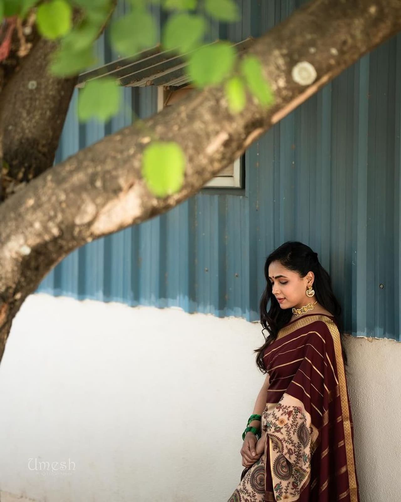 ಕಂದು ಬಣ್ಣದ ಸೀರೆ, ಅದಕ್ಕೆ ಮ್ಯಾಚ್ ಆಗುವ ಹಾಗೆ ಕಿವಿಯೊಲೆ, ಹಾಗೂ ಹಸಿರು ಬಣ್ಣದ ಬಳೆಗಳನ್ನು ಧರಿಸಿ ಮಿರ ಮಿರ ಮಿಂಚುತ್ತಿರುವ ಅನುಪಮಾ ಅಂದ ನೋಡುವುದೆ ಕಣ್ಣಿಗೆ ಒಂದು ರೀತಿಯ ಹಬ್ಬ. ಜೊತೆಗೆ ಅವರು ಧರಿಸಿರುವ ನೆಕ್ಲೇಸ್ ಸಹ ಹೈಲೈಟ್ ಆಗಿದೆ.