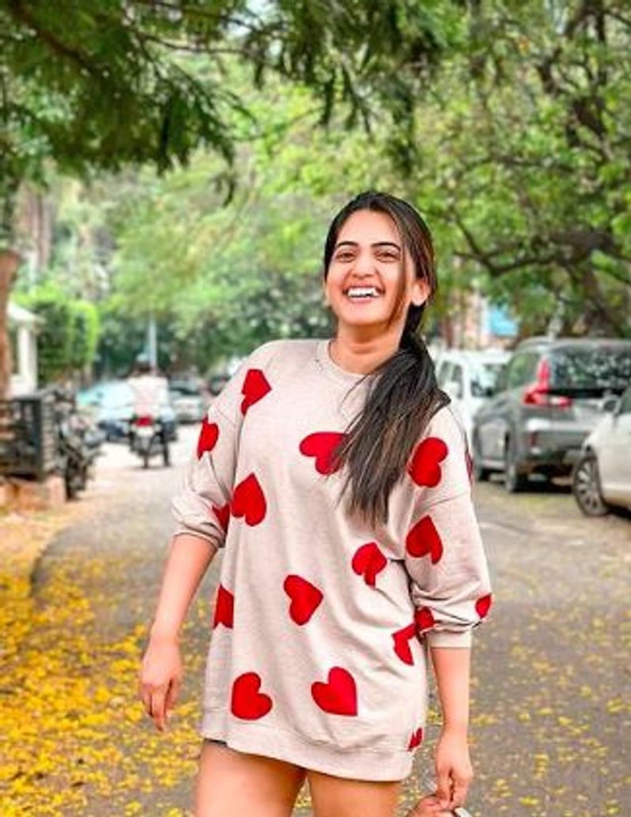 ಕೆಂಪು ಹಾರ್ಟ್ ಡಿಸೈನ್ ಇರುವ ಬಿಸ್ಕೆಟ್ ಬಣ್ಣದ ಸ್ವೆಟರ್ ಧರಿಸಿರುವ ಶ್ರವಂತಿ ಚೋಕಾರಪು ಪ್ಯಾಂಟ್ ಧರಿಸಿಲ್ಲ. ಮ್ಯಾಜ್ ಆಗುವಂತೆ ಚಪ್ಪಲಿ ಧರಿಸಿದ್ದಾರೆ ಅಷ್ಟೆ.