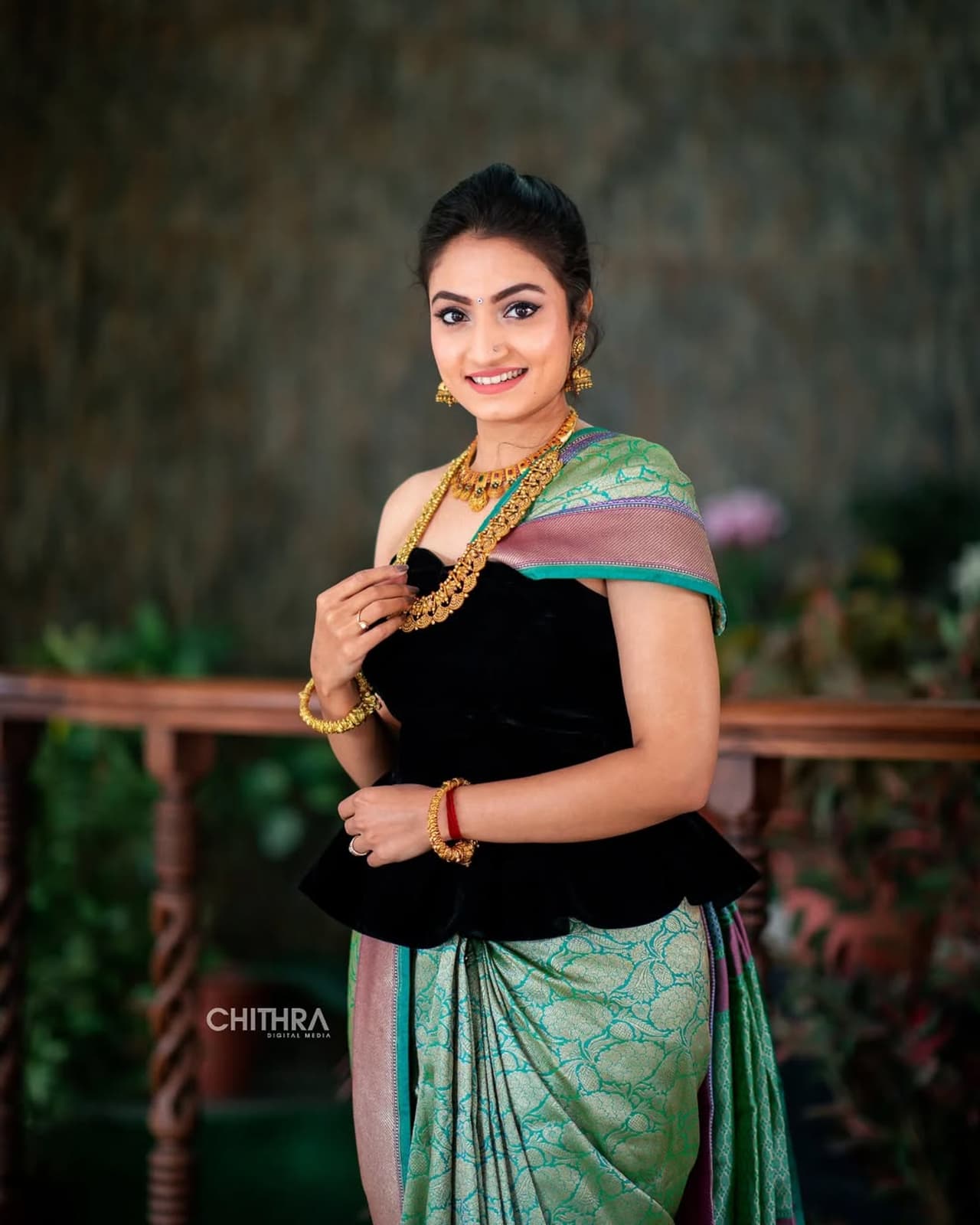 ಸುಂದರವಾದ ಹಸಿರು ಬಣ್ಣದ ಸಿಲ್ಕ್ ಸೀರೆಯುಟ್ಟಿರುವ ವೈಷ್ಣವಿ ಗೌಡ, ಅದಕ್ಕೆ ಮ್ಯಾಚ್ ಆಗದೇ ಇರುವಂತಹ ಒಂದು ಕಪ್ಪು ಬಣ್ಣದ ಟ್ಯೂಬ್ ಟಾಪನ್ನು ಸೀರೆಯ ಮೇಲೆ ಧರಿಸಿದ್ದಾರೆ. ಇದು ಸ್ವಲ್ಪ ವಿಚಿತ್ರ ಕಾಂಬಿನೇಶನ್ ಆಗಿದ್ದು, ಜನ ಈ ಲುಕ್ ನೋಡಿ ವಿವಿಧ ರೀತಿಯಲ್ಲಿ ಕಾಮೆಂಟ್ ಮಾಡುತ್ತಿರುತ್ತಾರೆ.