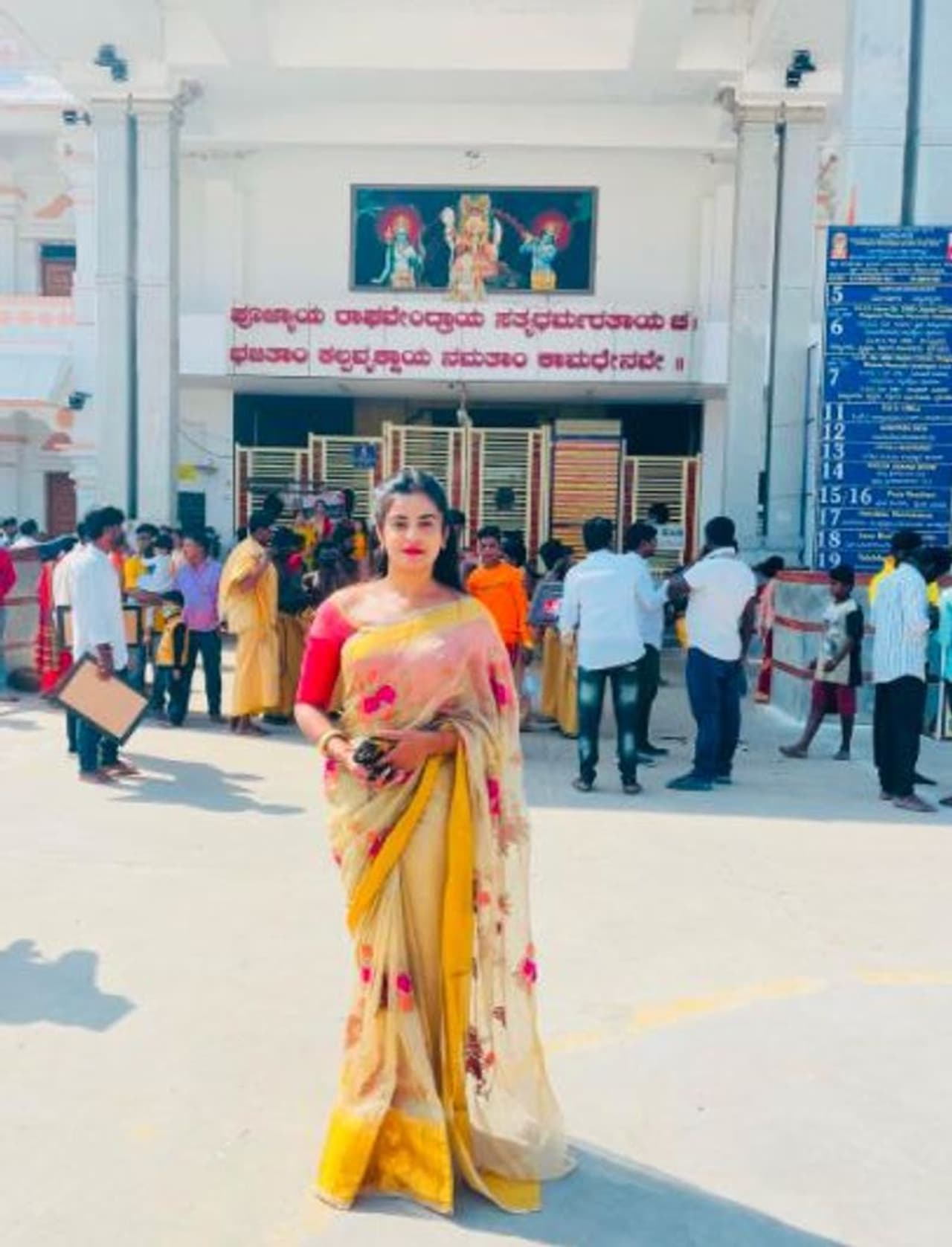 ಹಳದಿ ಮತ್ತು ಕೆಂಪು ಬಣ್ಣದ ಫ್ಲೋರಲ್ ಸೀರೆಯನ್ನು ಧರಿಸಿರುವ ನಮ್ರತಾ ರಾಯರ ಗುಡಿ ಮುಂದೆ ನಿಂತು ಫೋಟೋ ಕ್ಲಿಕ್ಕಿಸಿಕೊಂಡಿದ್ದಾರೆ.