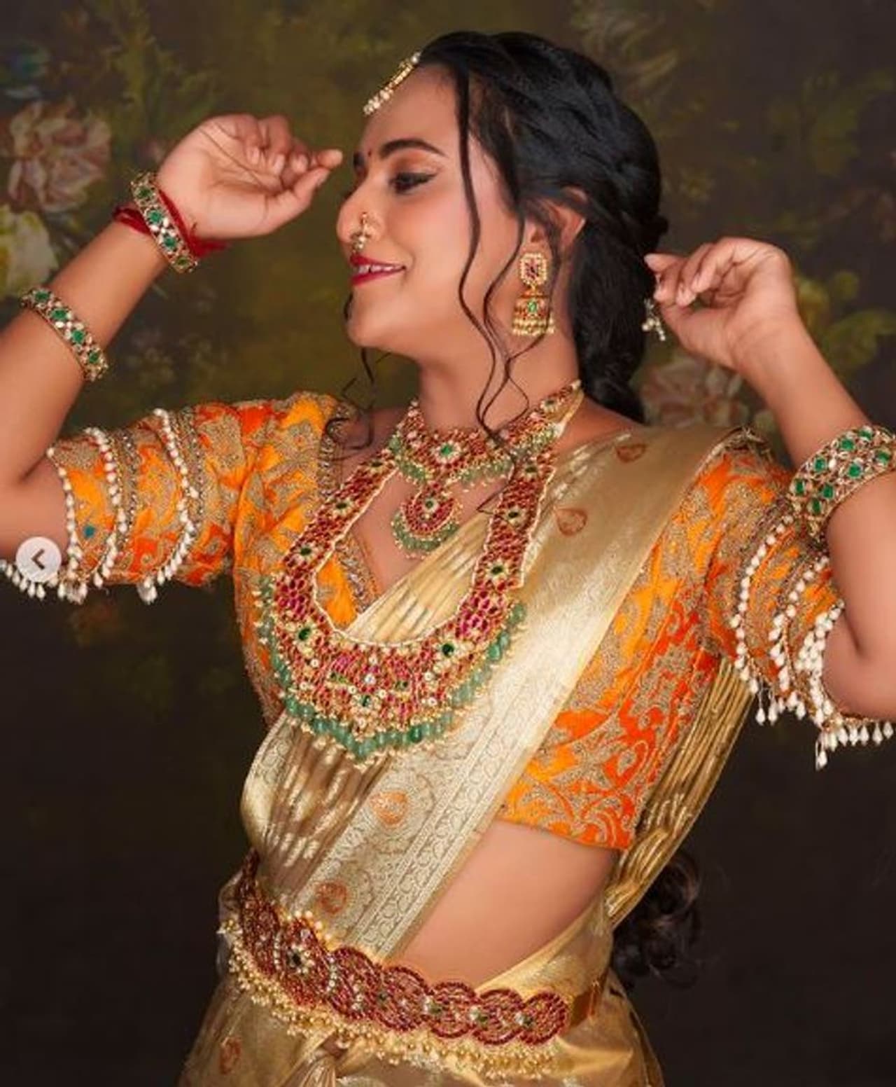ಗೋಲ್ಡ್ ಬಣ್ಣದ ರೇಶ್ಮೆ ಸೀರೆಗೆ ಆರೇಂಜ್ ಬಣ್ಣದ ಬ್ಲೌಸ್ ಧರಿಸಿದ್ದಾರೆ. ಇದಕ್ಕೆ ಮಧು ಮಗಳಂತೆ ಐಷಾರಾಮಿ ಆಭರಣಗಳನ್ನು ಧರಿಸಿದ್ದಾರೆ.