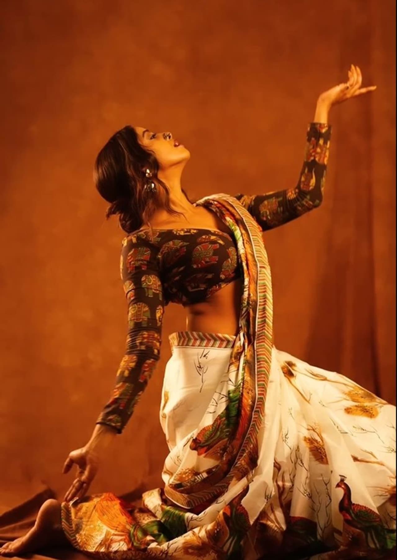 ಬಿಳಿ ಬಣ್ಣದ ಮೇಲೆ ನವಿಲಿನ ಪ್ರಿಂಟ್ ಇರುವ ಸೀರೆಯುಟ್ಟು, ಅದಕ್ಕೊಪ್ಪುವ ಕಪ್ಪು ಬಣ್ಣದ ಕಲಂಕಾರಿ ಬ್ಲೌಸ್ ಧರಿಸಿ, ದೊಡ್ಡದಾದ ಜುಮುಕಿ, ಕಾಸಗಲ ಬೊಟ್ಟು ತೊಟ್ಟು, ವಿವಿಧ ಭಾವ ಭಂಗಿಯಲ್ಲಿ ಸಖತ್ತಾಗಿ ಕಾಣಿಸುತ್ತಿದ್ದಾರೆ ದರ್ಶಿನಿ ಡೆಲ್ಟಾ.