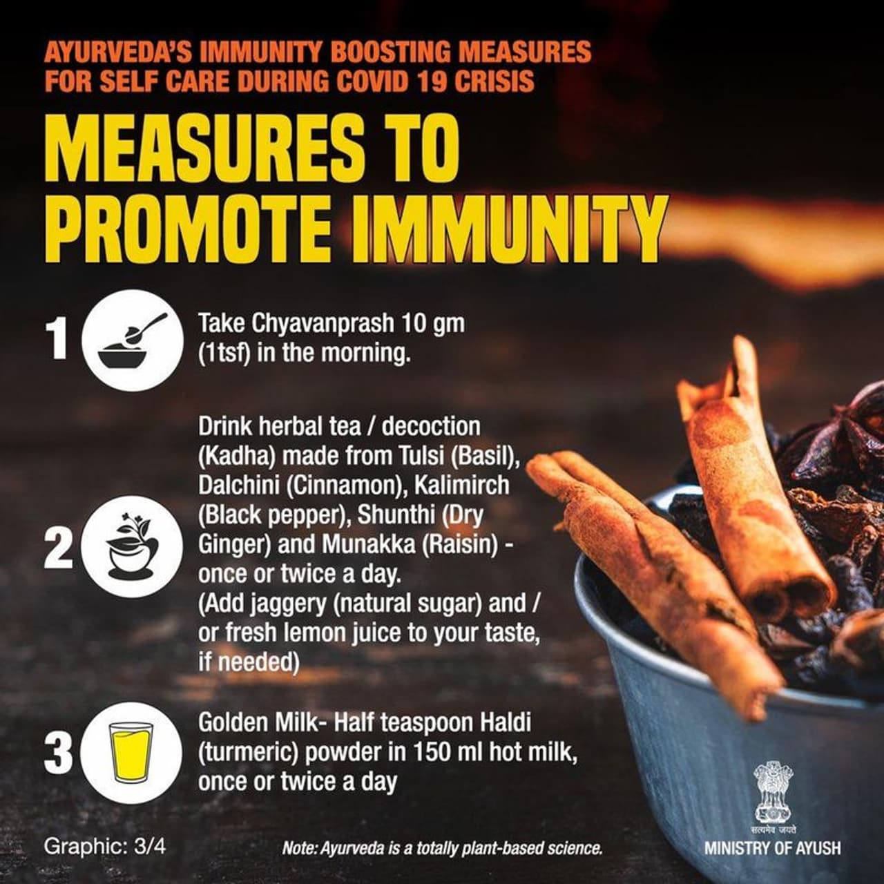 ಕೊರೋನಾ ವೈರಸ್ ಬಂದರೆ ಅದನ್ನು ಗುಣಪಡಿಸಲು ನೇರವಾದ ಮದ್ದುಗಳು ನಮ್ಮ ಸಾಂಪ್ರದಾಯಿಕ ವೈದ್ಯ ಪದ್ಧತಿಗಳಲ್ಲಿ ಇದೆಯೋ ಇಲ್ಲವೋ ಗೊತ್ತಿಲ್ಲ. ಬಹುಶಃ ಸರಿಯಾಗಿ ಹುಡುಕಿದರೆ ಸಿಗಲೂಬಹುದು. ಅನ್ವೇಷಣೆ ನಡೆಯಬೇಕಷ್ಟೆ. ಆದರೆ, ದೇಹದ ರೋಗ ನಿರೋಧಕ ಶಕ್ತಿ ಹೆಚ್ಚಿಸಿ ಕೊರೋನಾ ಬಾರದಂತೆ ದೂರವಿಡಲಂತೂ ಸಾಧ್ಯವಿದೆ. ಅದು ಹೇಗೆ ಅಂತ ಆಯುಷ್ ಇಲಾಖೆ ಹೇಳಿದೆ. ಅದು ಹೀಗೆ.