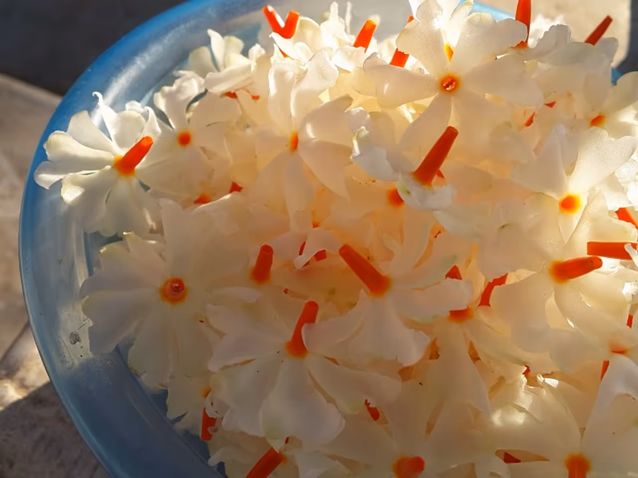 ಮಲ್ಲಿಗೆಯಂಥ ದಳಗಳು, ಕೇಸರಿ ಬಣ್ಣದ ತೊಟ್ಟುಗಳನ್ನು ಹೊಂದಿ ಮರದ ತುಂಬಾ ನಕ್ಷತ್ರಗಳಂತೆ ಹೊಳೆಯುವ ಪಾರಿಜಾತದ ಚೆಲುವು ಬಹಳ ಆಕರ್ಷಕ. ಭಾರತ, ಪಾಕಿಸ್ತಾನ, ಥೈಲ್ಯಾಂಡ್, ನೇಪಾಳ, ಇಂಡೋನೇಶ್ಯಾಗಳಲ್ಲಿ ಕಂಡುಬರುವ ಪಾರಿಜಾತ ಏಷ್ಯಾದ ಎಗ್ಗಿಲ್ಲದ ಚೆಲುವೆ. ಸ್ವರ್ಗದ ಐದು ವೃಕ್ಷಗಳಲ್ಲಿ ಪಾರಿಜಾತವೂ ಇದೆ. ಹೌದು, ಪುರಾಣ ಪುಣ್ಯ ಕತೆಗಳಲ್ಲಿ ಪಾರಿಜಾತ ಹಲವೆಡೆ ಸ್ಥಾನ ಪಡೆದುಕೊಂಡಿದೆ. ಪಾವಿತ್ರತೆಯ ಕಾರಣದಿಂದಲೇ ಮೊನ್ನೆ ರಾಮಜನ್ಮಭೂಮಿಯಲ್ಲಿ ಭೂಮಿಪೂಜೆ ನೆರವೇರಿಸುವಾಗ ಪ್ರಧಾನಿ ನರೇಂದ್ರ ಮೋದಿ ಕೂಡಾ ಪಾರಿಜಾತದ ಸಸ್ಯ ನೆಟ್ಟು ಪೂಜೆ ನೆರವೇರಿಸಿದರು.