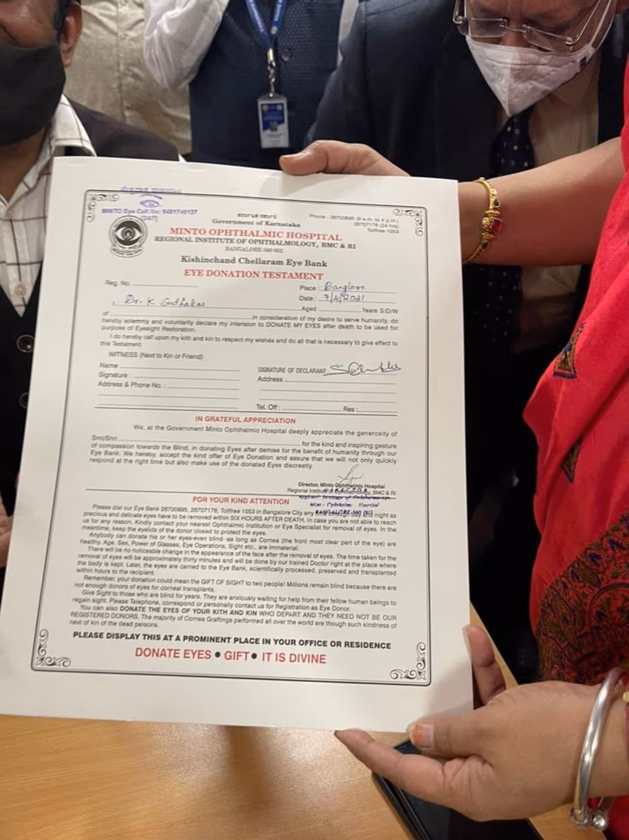 ಇದೇ ವೇಳೆ ಮಾತನಾಡಿದ ಸಚಿವ ಡಾ. ಕೆ.ಸುಧಾಕರ್ ಅವರು, ನೇತ್ರದಾನ ಮಾಡುವ ಸಂಕಲ್ಪ ಕೈಗೊಂಡಿರುವುದು ಸಾರ್ಥಕ ಭಾವ ಮೂಡಿಸಿದೆ. ನಮ್ಮ ಕಣ್ಣು ನಮ್ಮ ಮರಣದ ನಂತರ ಮತ್ತೊಬ್ಬರಿಗೆ ದಾರಿದೀಪವಾಗಲಿದೆ. ಪ್ರತಿಯೊಬ್ಬರು ನೇತ್ರದಾನ ಮಾಡುವ ಸಂಕಲ್ಪ ಮಾಡಬೇಕು ಎಂದು ಅವರು ಮನವಿ ಮಾಡಿದ್ದಾರೆ.