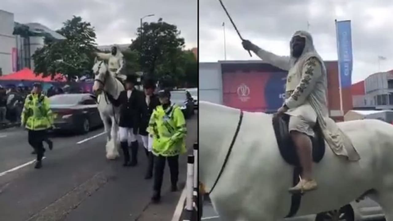 ಮ್ಯಾಂಚೆಸ್ಟರ್(ಜೂ.16): ಭಾರತ ಹಾಗೂ ಪಾಕಿಸ್ತಾನ ನಡುವಿನ ವಿಶ್ವಕಪ್ ಪಂದ್ಯ ಅಭಿಮಾನಿಗಳ ಕುತೂಹಲನ್ನು ಇಮ್ಮಡಿಗೊಳಿಸಿದೆ. ಟಾಸ್ ಗೆದ್ದು ಬೌಲಿಂಗ್ ಆಯ್ಕೆ ಮಾಡಿಕೊಂಡಿರುವ ಪಾಕಿಸ್ತಾನ ಕರಾರುವಕ್ ದಾಳಿಗೆ ಮುಂದಾಗಿದೆ. ಈ ರೋಚಕ ಪಂದ್ಯ ವೀಕ್ಷಿಸಲು ಅಭಿಮಾನಿಯೋರ್ವ ಕುದುರೆ ಏರಿ ಕ್ರೀಡಾಂಗಣಕ್ಕೆ ಆಗಮಿಸಿದ್ದಾನೆ.