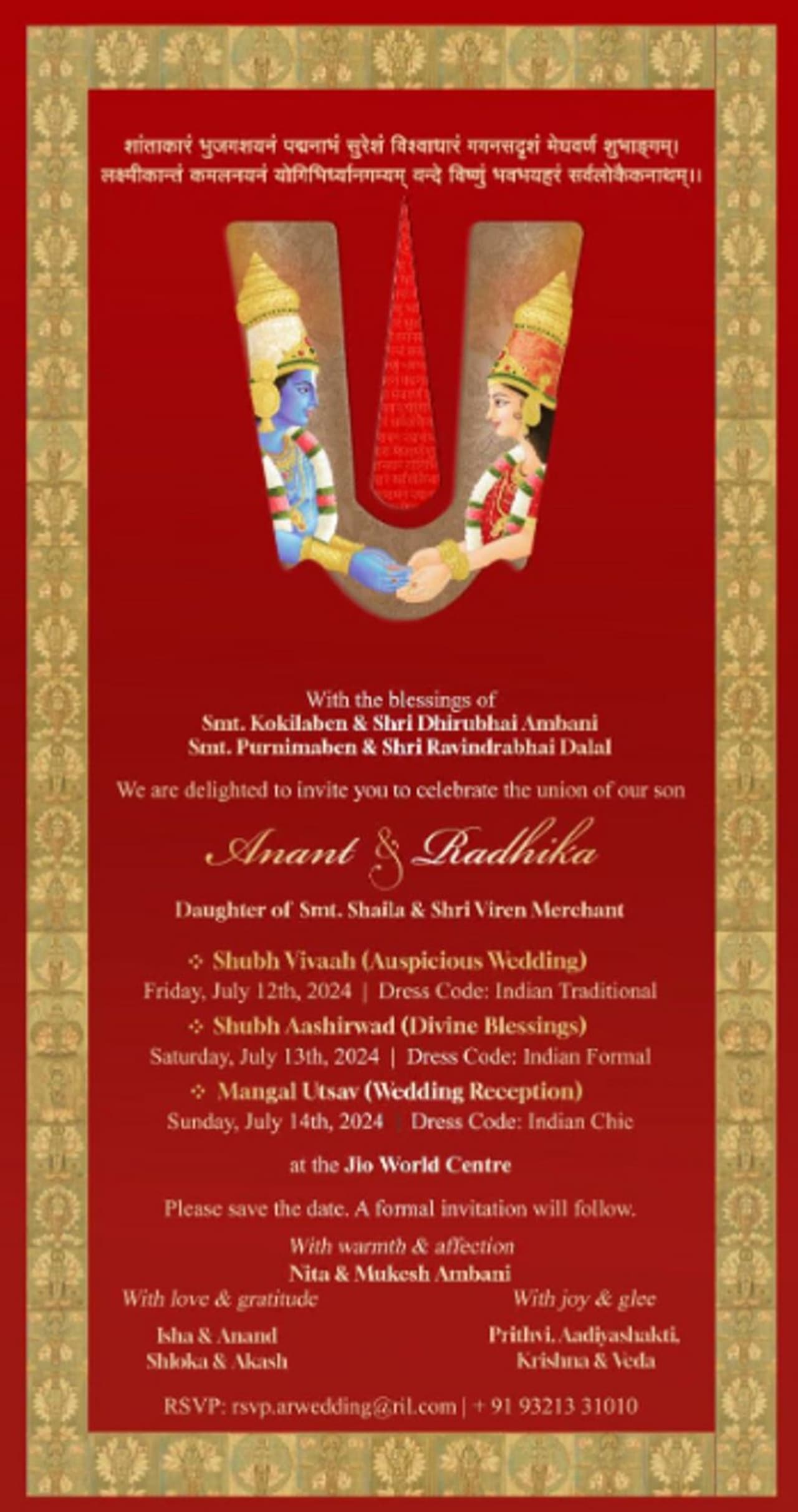 ಅದರಂತೆ, 12ರಂದು ವಿವಾಹ- ಇದಕ್ಕೆ ಎಲ್ಲರೂ ಭಾರತೀಯ ಸಾಂಪ್ರದಾಯಿಕ ಉಡುಗೆಯಲ್ಲಿ ಬರಬೇಕು, 13ರಂದು ಆಶೀರ್ವಾದ ಕಾರ್ಯಕ್ರಮ- ಇದಕ್ಕೆ ಭಾರತೀಯ ಫಾರ್ಮಲ್ ಹಾಗೂ 14ರಂದು ಆರತಕ್ಷತೆ ಸಮಾರಂಭವಿದ್ದು, ಇದಕ್ಕೆ ಇಂಡಿಯನ್ ಚಿಕ್ ಥೀಮ್ ಬಟ್ಟೆಗಳನ್ನು ಧರಿಸಿ ಬರಲು ಕೇಳಲಾಗಿದೆ. ಈ ಆಮಂತ್ರಣದ ಬೆನ್ನಲ್ಲೇ ಅಧಿಕೃತ ಆಮಂತ್ರಣ ಬರಲಿದೆ ಎಂದೂ ಹೇಳಲಾಗಿದೆ.