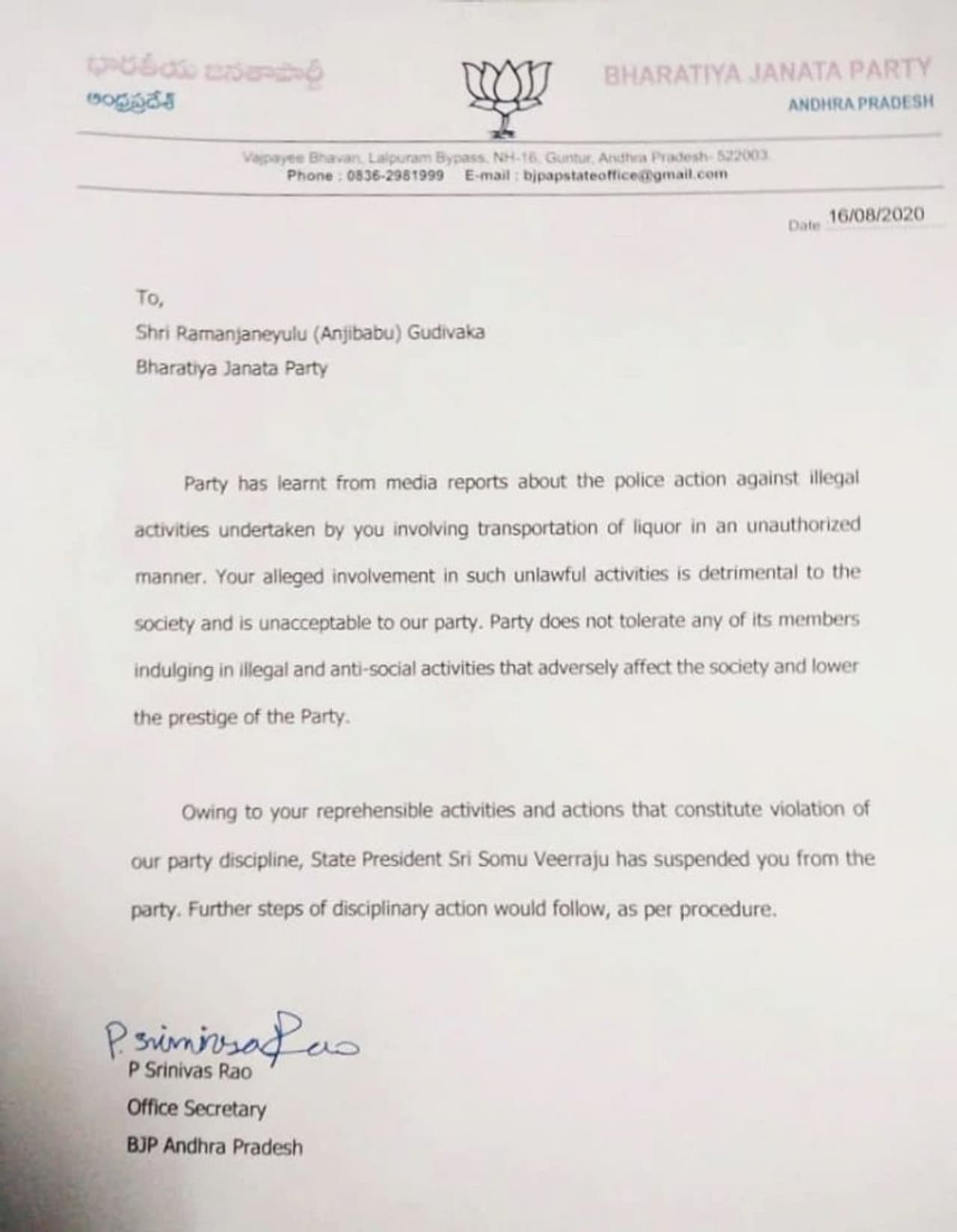 ಪಕ್ಷದ ಮುಖಂಡ ಅಕ್ರಮವಾಗಿ ಮದ್ಯ ಸಾಗಿಸುವಾಗ ಸಿಕ್ಕಿ ಬಿದ್ದು ಬಿಜೆಪಿ ತೀವ್ರ ಮುಖಭಂಗ ಎದುರಿಸಿದೆ. ಆಂಧ್ರ ಪ್ರದೇಶದ ಬಿಜೆಪಿ ಮುಖಂಡ ಜಿ. ರಾಮಾಂಜನೇಯುಲು ಅಲಿಯಾಸ್ ಅಂಜಿ ಬಾಬು ಎಂಬಾತ ಅಕ್ರಮವಾಗಿ ಮದ್ಯ ಸಾಗಾಟ ಮಾಡುವ ವೇಳೆ ಸಿಕ್ಕಿಬಿದ್ದಿದ್ದಾನೆ.