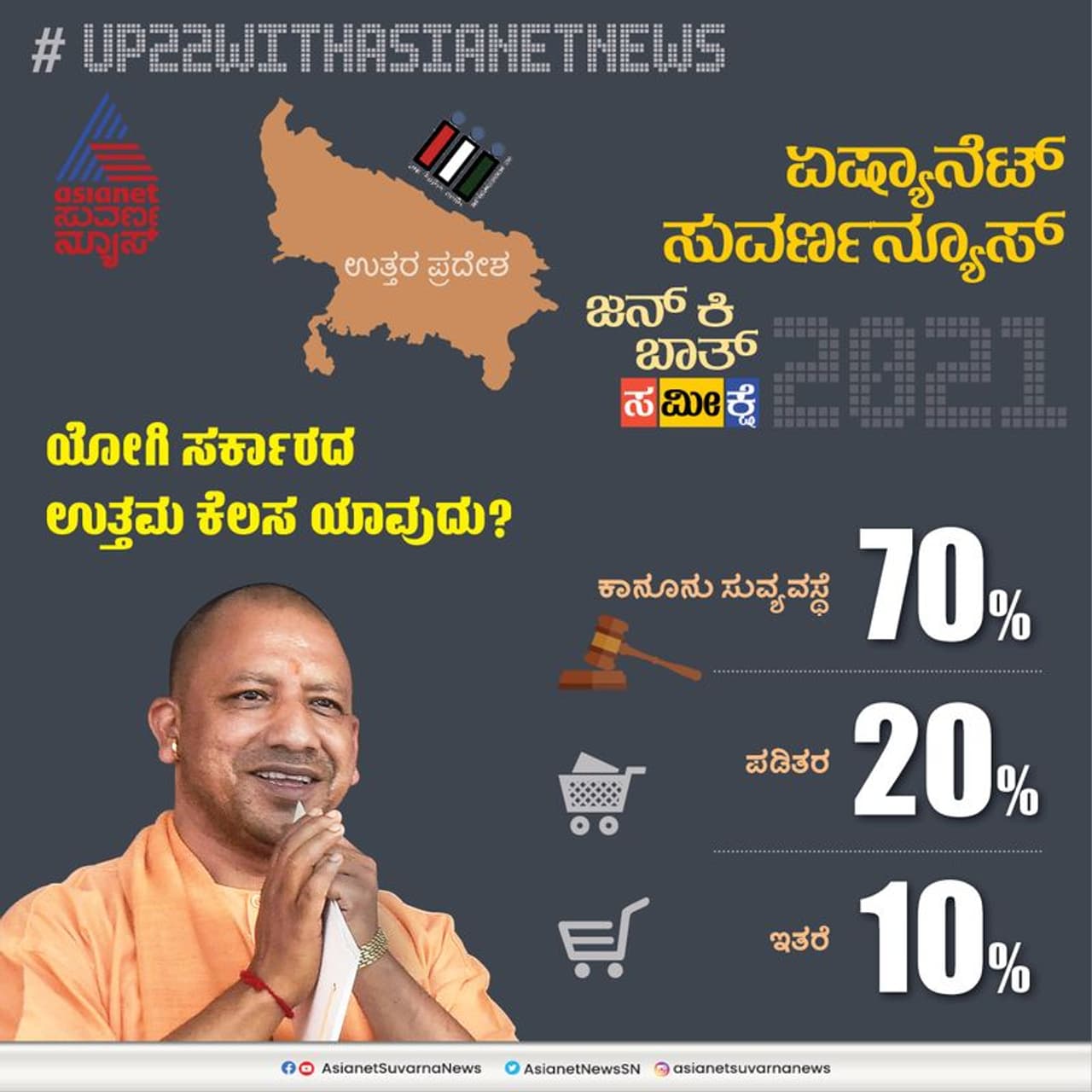 ಜನಾಭಿಪ್ರಾಯ: ಯೋಗಿ ಆದಿತ್ಯನಾಥ್ ಸರ್ಕಾರ ಕಾನೂನು ಸುವ್ಯವಸ್ಥೆ ಅತ್ಯುತ್ತಮವಾಗಿ ನಿರ್ವಹಿಸಿದೆ ಎಂದು ಶೇ. 70ರಷ್ಟು ಮಂದಿ ಹೇಳಿದ್ದರೆ, ಶೇ. 20ರಷ್ಟು ಮಂದಿಗೆ ಸರ್ಕಾರ ಪಡಿತರ ಹಂಚುತ್ತಿದ್ದ ವೈಖರಿ ಇಷ್ಟವಾಗಿದೆ. ಇನ್ನು ಶೇ. 10ರಷ್ಟು ಮಂದಿಗೆ ಇತರ ಕಾರ್ಯಗಳು ಹಿಡಿಸಿವೆ.