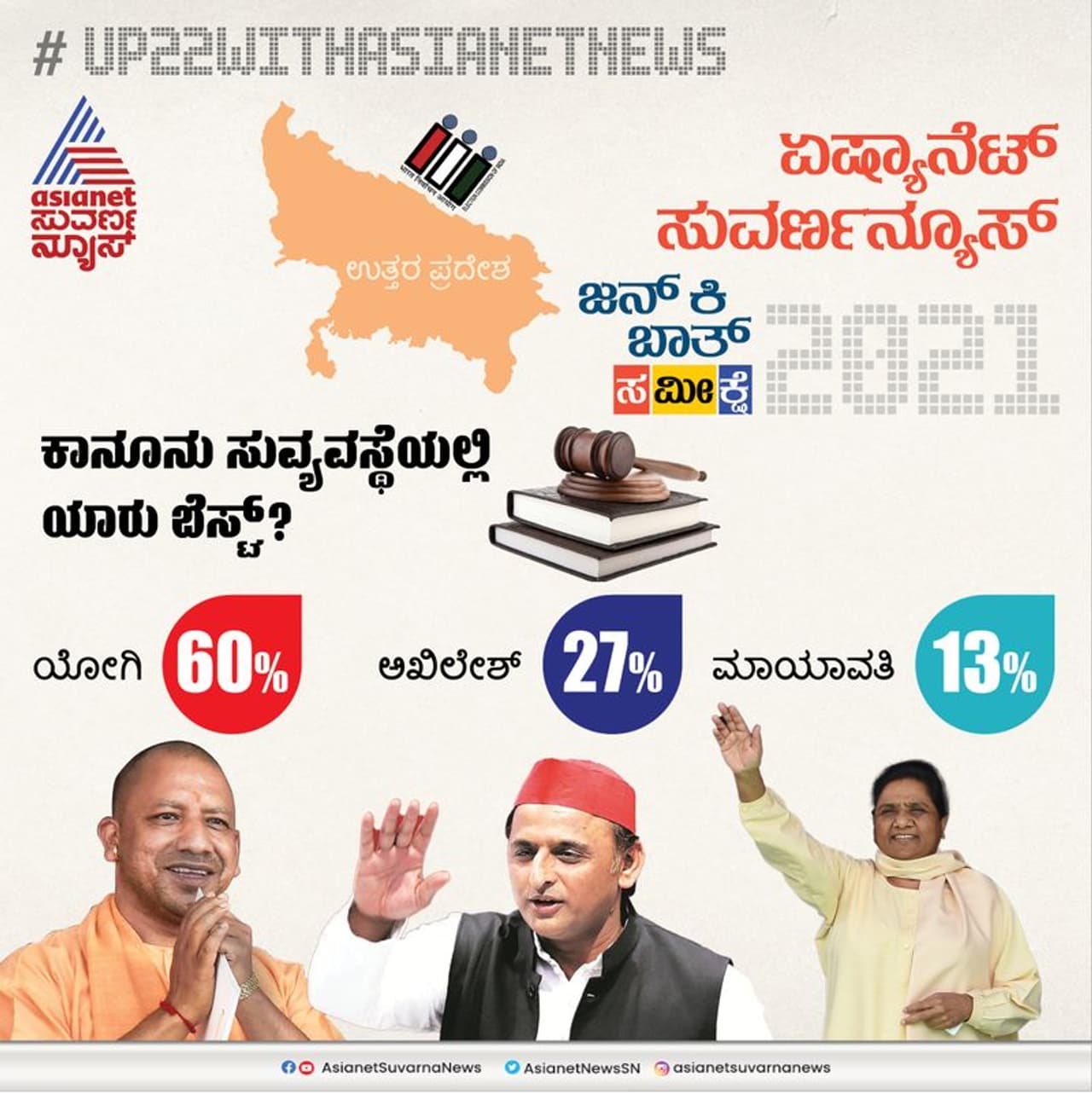 ಜನಾಭಿಪ್ರಾಯ: ಕಾನೂನು ಸುವ್ಯವಸ್ಥೆ ಅಖಿಲೇಶ್ ಸರ್ಕಾರದ ಅವಧಿಯಲ್ಲಿ ಉತ್ತಮವಾಗಿತ್ತು ಎಂದು ಶೇ. 27ಷ್ಟು ಮಂದಿ ಹೇಳಿದ್ದರೆ, ಶೇ. 13ರಷ್ಟು ಮಂದಿ ಮಾಯಾವತಿ ಅವಧಿಯಲ್ಲಿ ಚೆನ್ನಾಗಿತ್ತು ಎಂದಿದ್ದಾರೆ. ಆದರೆ ಶೇ. 60ರಷ್ಟು ಮಂದಿ ಯೋಗಿ ಆಡಳಿತ ಅವಧಿಯಲ್ಲಿ ಉತ್ತಮವಾಗಿತ್ತು ಎಂದು ಅಭಿಪ್ರಾಯ ವ್ಯಕ್ತಪಡಿಸಿದ್ದಾರೆ.