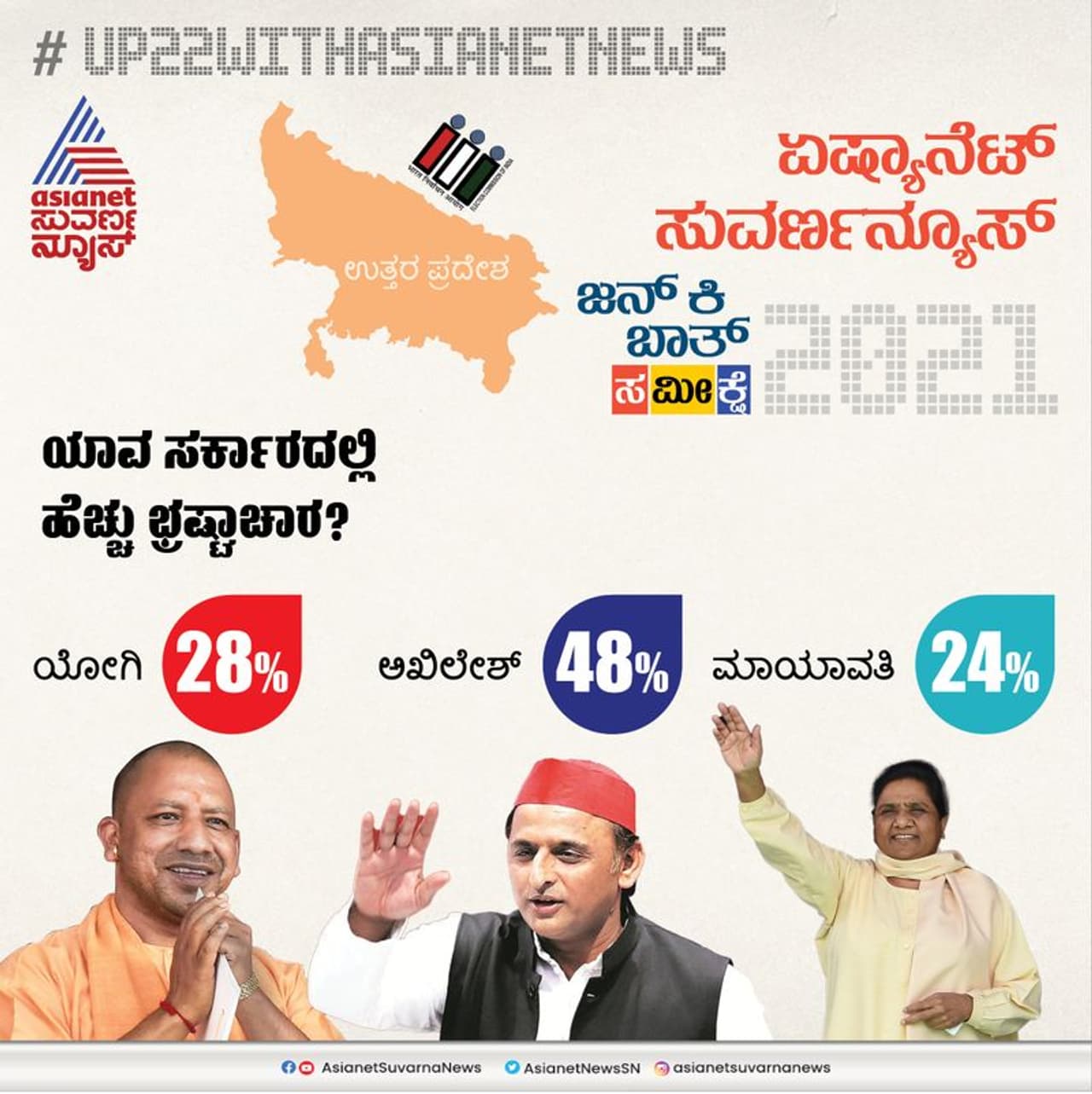 ಉತ್ತರ ಪ್ರದೇಶದ ಈ ಹಿಂದಿನ ಅಖಿಲೇಶ್ ಯಾದವ್ನ ಆಡಳಿತ ಶೇಕಡಾ 48 ರಷ್ಟು ಭ್ರಷ್ಟಾಚಾರದಿಂದ ತುಂಬಿತ್ತು ಎಂದು ಸಮೀಕ್ಷೆಯಲ್ಲಿ ಜನರು ಅಭಿಪ್ರಾಯ ವ್ಯಕ್ತಪಡಿಸಿದ್ದಾರೆ. ಈ ಪ್ರಮಾಣ ಯೋಗಿ ಆಡಳಿತದಲ್ಲಿ ಶೇಕಡಾ 28ಕ್ಕೆ ಇಳಿದಿದೆ. ಇನ್ನು ಮಾಯಾವತಿ ಆಡಳಿತದಲ್ಲಿ ಭ್ರಷ್ಟಾಚಾರರ ಶೇಕಡಾ 24 ರಷ್ಟಿತ್ತು. ಆದರೆ ಅಭಿವೃದ್ಧಿ ಕಾರ್ಯಗಳು ಕುಂಟಿತವಾಗಿತ್ತು ಅನ್ನೋದು ಉತ್ತರ ಪ್ರದೇಶದ ಜನರ ಅಭಿಪ್ರಾಯವಾಗಿದೆ.