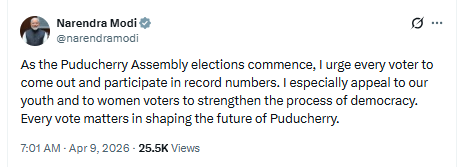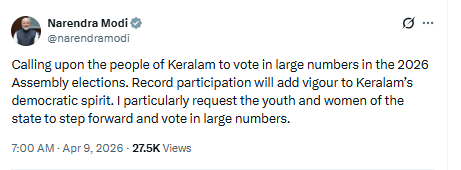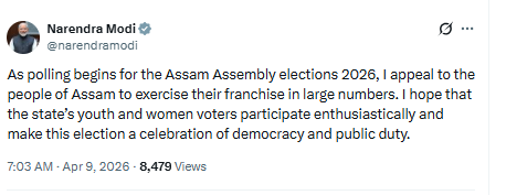 ಅಸ್ಸಾಂ, ಕೇರಳ ಮತ್ತು ಪುದುಚೇರಿಯಲ್ಲಿ ವಿಧಾನಸಭಾ ಚುನಾವಣೆಯ ಮತದಾನ ಆರಂಭವಾದ ಬೆನ್ನಲ್ಲೇ, ಪ್ರಧಾನಿ ನರೇಂದ್ರ ಮೋದಿ ಮತದಾರರಿಗೆ ಸಂದೇಶಗಳನ್ನು ಪೋಸ್ಟ್ ಮಾಡಿದ್ದಾರೆ.