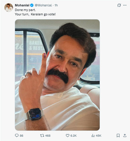 ಕೇರಳದ ಹಿರಿಯ ನಟ ಮೋಹನ್ ಲಾಲ್ ಚುನಾವಣೆಯಲ್ಲಿ ತಮ್ಮ ಹಕ್ಕು ಚಲಾಯಿಸಿದ್ದಾರೆ. ಅದರೊಂದಿಗೆ ಎಲ್ಲರೂ ಮತದಾನ ಮಾಡುವಂತೆ ಮನವಿ ಮಾಡಿದ್ದಾರೆ.