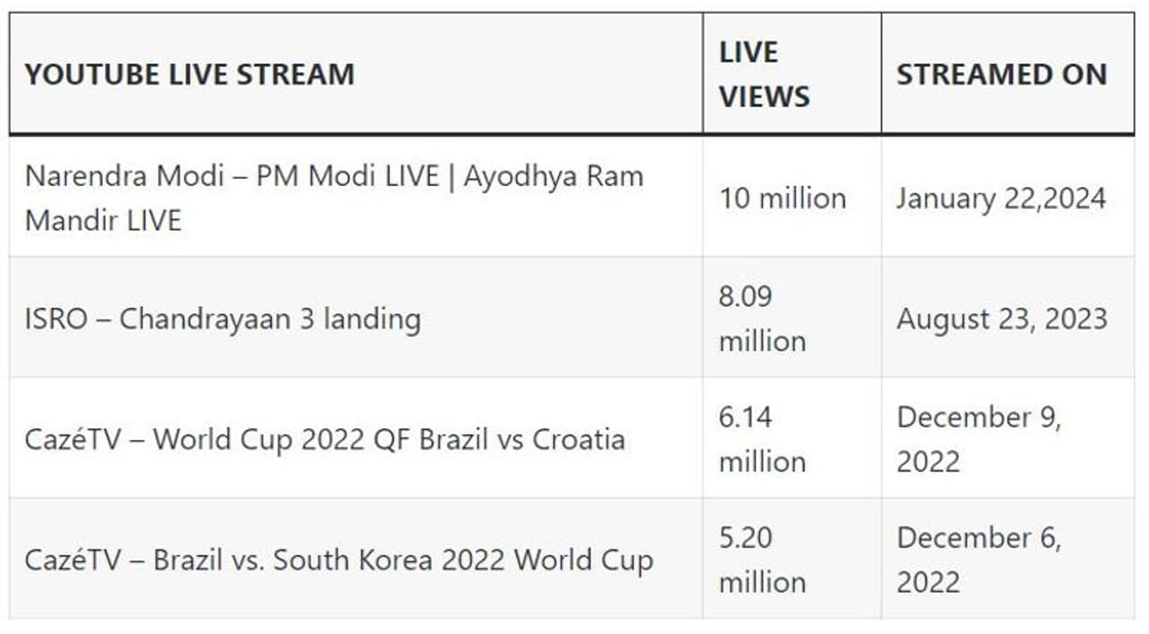 ಈ ಕಾರ್ಯಕ್ರಮ ಜರುಗುವುದಕ್ಕೂ ಮೊದಲು ಅಂದರೆ ಕಳೆದ ಭಾನುವಾರದವರೆಗೂ 2023ರ ಆಗಸ್ಟ್ 23 ರಂದು ಲಾಂಚ್ ಆದ ಚಂದ್ರಯಾನ 3 ಕಾರ್ಯಕ್ರಮವೂ ಯೂಟ್ಯೂಬ್ನಲ್ಲಿ ಅತೀ ಹೆಚ್ಚು ವೀಕ್ಷಿಸಿದ ಇದುವರೆಗಿನ ಲೈವ್ ಸ್ಟ್ರೀಮ್ ಆಗಿತ್ತು. 8.9 ಮಿಲಿಯನ್ ವೀಕ್ಷಣೆಯಿಂದಾಗಿ ವಿಶ್ವದಲ್ಲೇ ಮೊದಲ ಸ್ಥಾನ ಪಡೆದಿತ್ತು. ಇದರ ನಂತರದ ಸ್ಥಾನದಲ್ಲಿ ಬ್ರೆಜಿಲ್ ಹಾಗೂ ಕ್ರೊಯೇಷಿಯಾ ನಡುವೆ ನಡೆದ 2022ರ ಫುಟ್ಬಾಲ್ ವಿಶ್ವಕಪ್ ಲೈವ್ ಸ್ಟ್ರೀಮ್ ಇತ್ತು, ಇದು 6.14 ಮಿಲಿಯನ್ ವೀಕ್ಷಣೆ ಗಳಿಸಿತ್ತು.