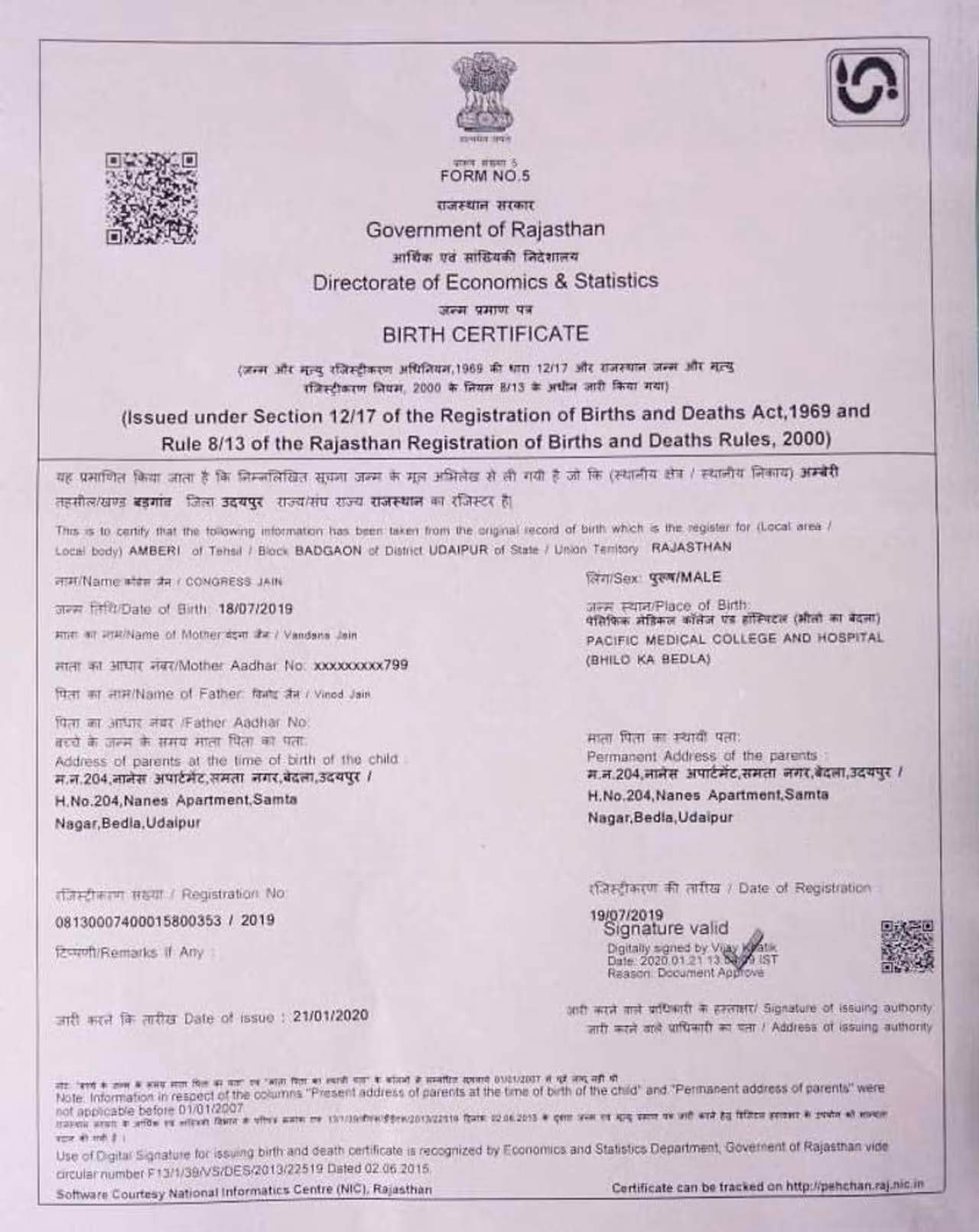 ವಿನೋದ್ ಜೈನ್ ಎಂಬವರು 2019ರ ಜುಲೈನಲ್ಲಿ ಹುಟ್ಟಿದ್ದ ತನ್ನ ಮಗುವಿಗೆ ಈ ಹೆಸರು ಇಟ್ಟಿದ್ದು, ಅದೇ ಹೆಸರಿನಲ್ಲಿ ಜನ್ಮ ಪ್ರಮಾಣ ಪತ್ರ ಕೂಡ ಮಾಡಿಸಿಕೊಂಡಿದ್ದಾರೆ.