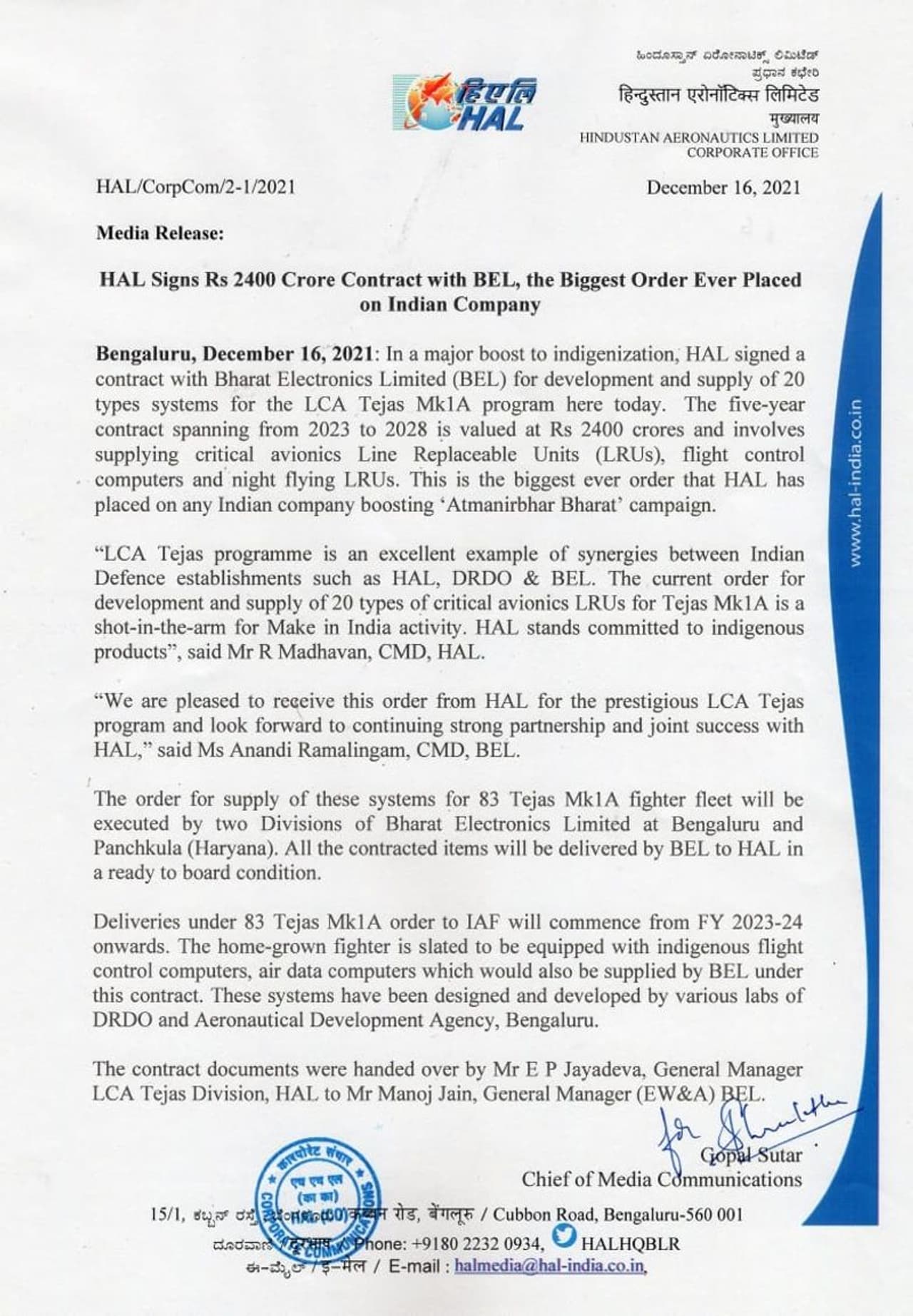 ಪ್ರತಿಷ್ಠಿತ ಎಲ್ಸಿಎ ತೇಜಸ್ ಯೋಜನೆಗಾಗಿ ಎಚ್ಎಎಲ್ ಜೊತೆ ಒಪ್ಪಂದ ಮಾಡಿಕೊಂಡಿರುವುದಕ್ಕೆ ನಾವು ಸಂತಸಪಡುತ್ತೇವೆ. ಎಚ್ಎಎಲ್ನೊಂದಿಗೆ ಬಲವಾದ ಪಾಲುದಾರಿಕೆ ಮತ್ತು ಜಂಟಿ ಯಶಸ್ಸನ್ನು ಮುಂದುವರಿಸಲು ಎದುರು ನೋಡುತ್ತಿದ್ದೇವೆ ಎಂದು ಬಿಇಎಲ್ನ ಸಿಎಂಡಿ ಆನಂದಿ ರಾಮಲಿಂಗಂ ಹೇಳಿದ್ದಾರೆ.